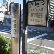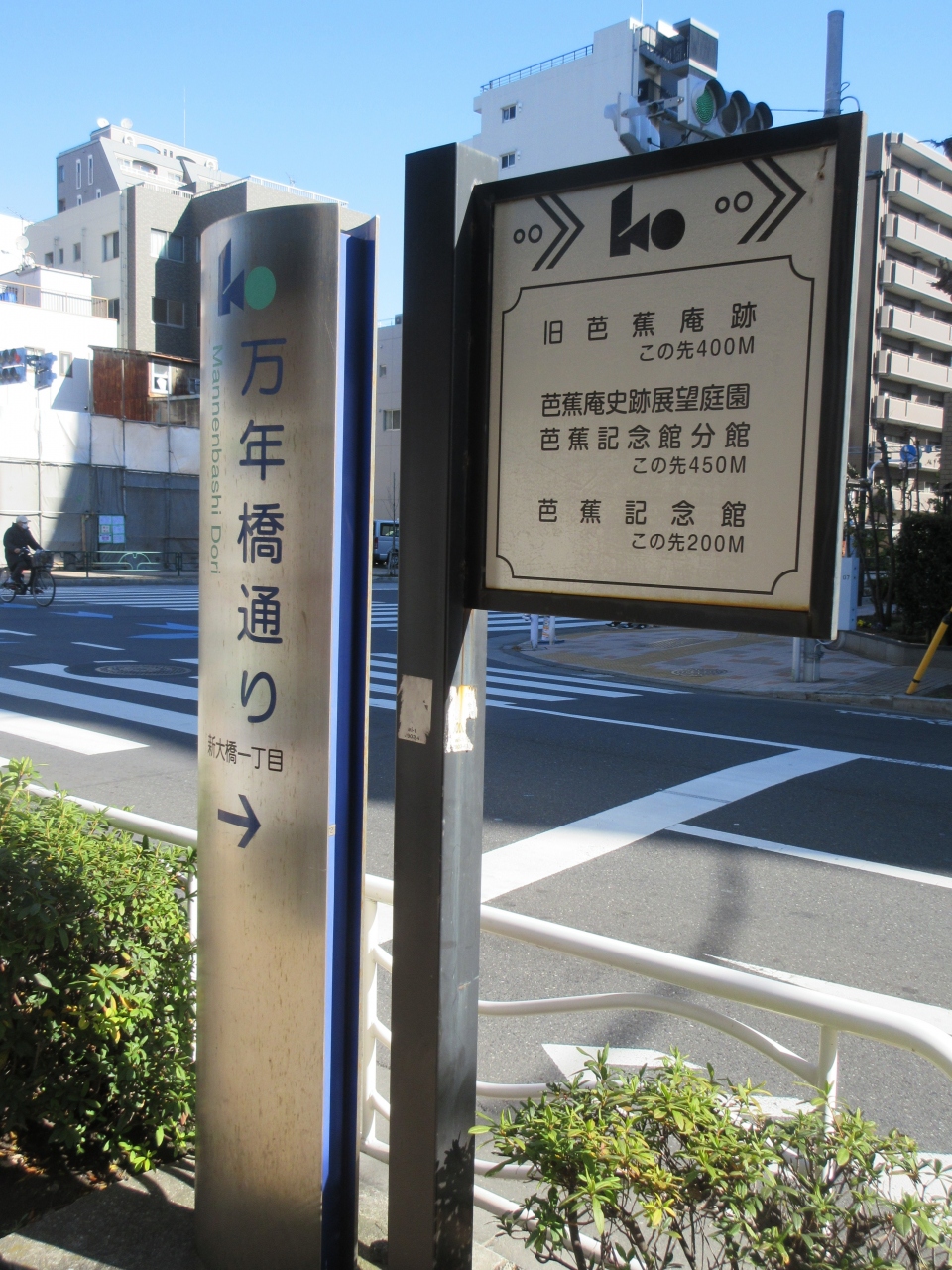 森下駅A1出口から新大橋通りを西へ進んだ新大橋交差点が万年橋通りの北端に当たります。南は小名木川に架かる万年橋を渡った先の清洲橋通りまでです。広い通りで、休日の午前は車の交通量も人通りも少なかったです。マンションや住宅、倉庫や会社などが両側に建っています。芭蕉記念館が通りに面して建ち、芭蕉稲荷神社や芭蕉庵史跡展望庭園が万年橋通りの近くにあるので、松尾芭蕉の足跡を巡る散策に歩く通りです。広くて静かだったので気持ちよく歩きました。