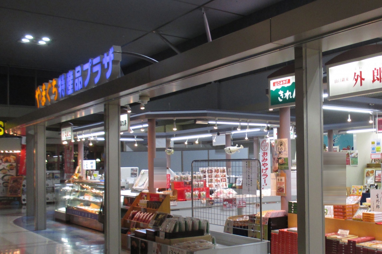 やまぐち特産品プラザはターミナルビルの2階にありますが、4つのお店が入っている商業スペースです。目立つところには、お土産にしやすい海鮮系のやなぎだとお菓子のきれん製菓です。ほかの1つはやまぐちの地酒・鍋島というお店で、全国ブランドになった旭酒造の獺祭が目立っていますが、岩国の八百新酒造の雁木(かんぎ)もいろいろと揃っていてお酒好きには人気のようです。もう1つはめぐり館で萩焼を扱っていました。