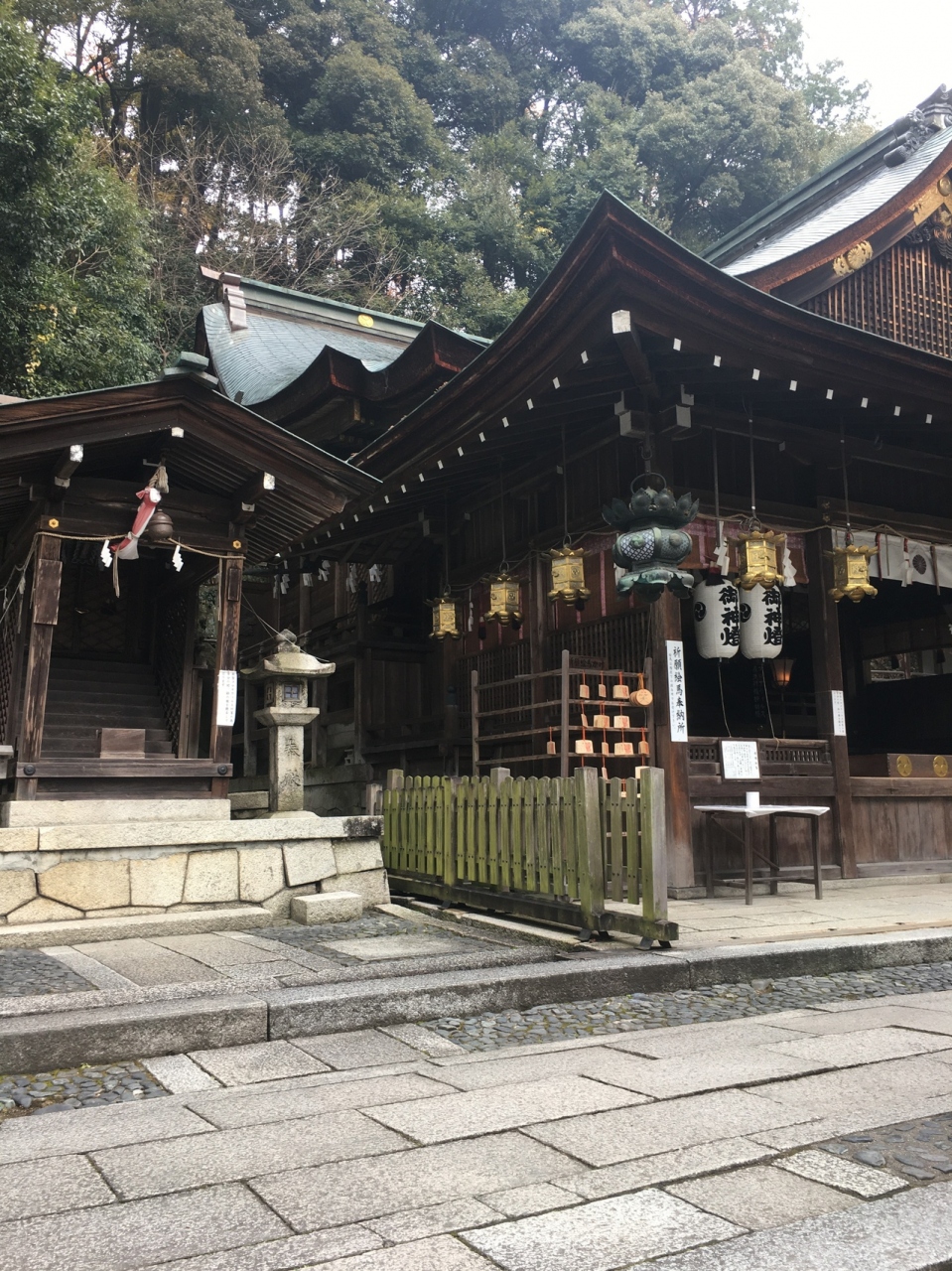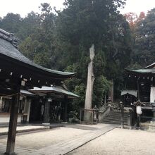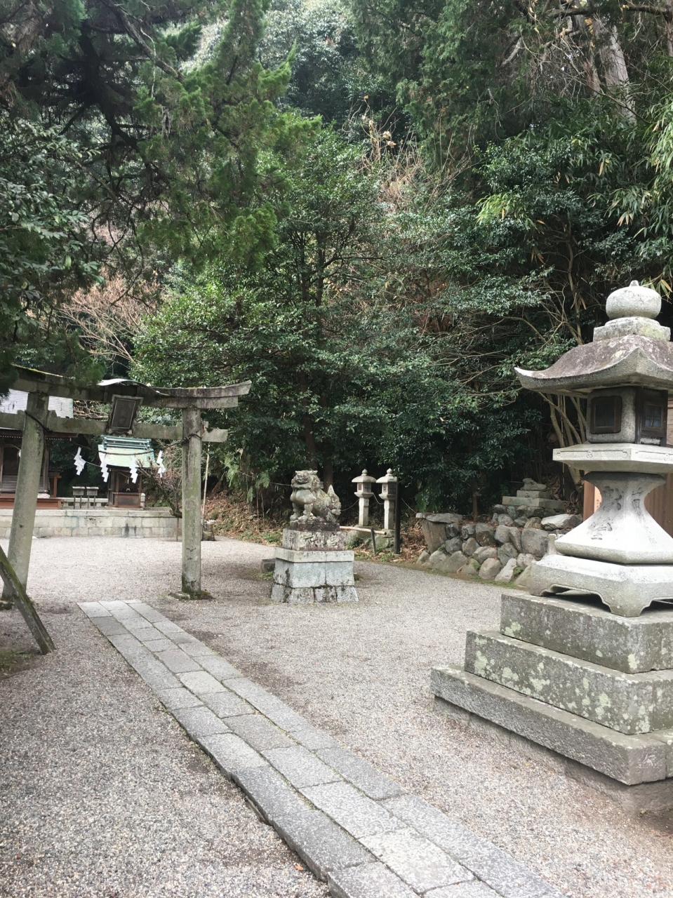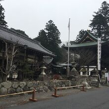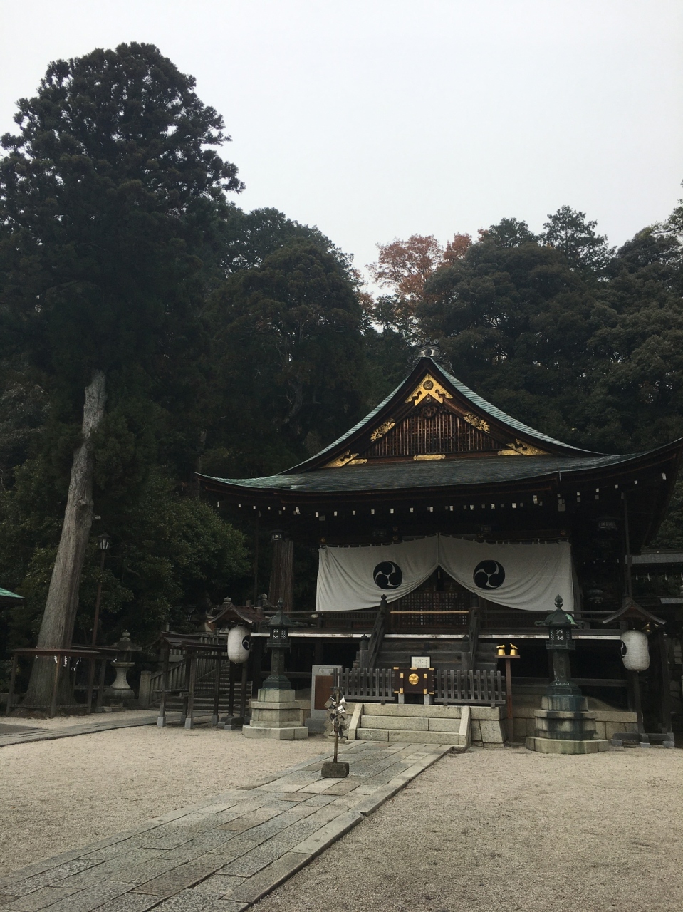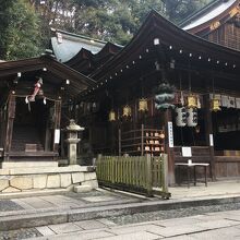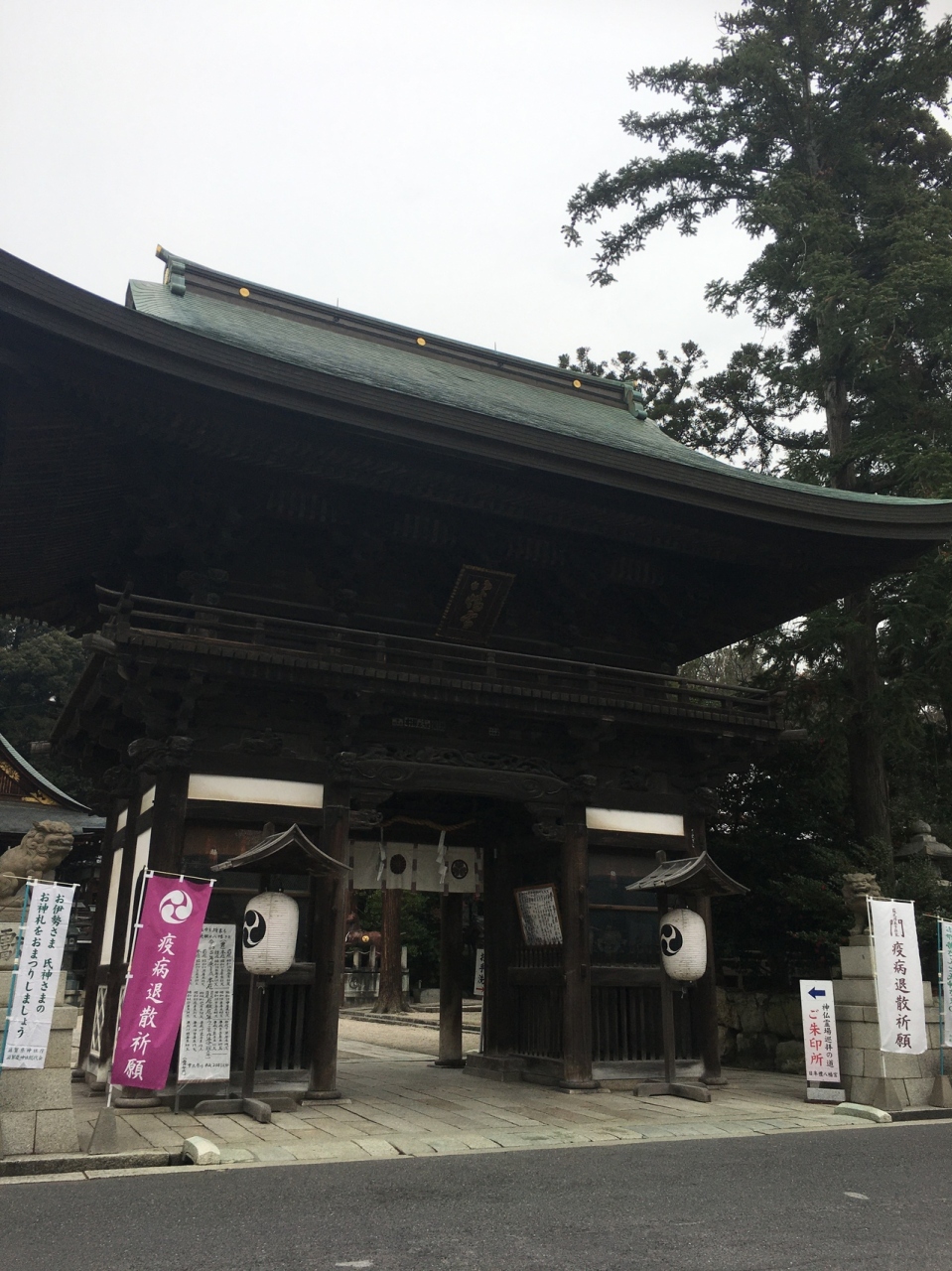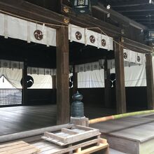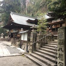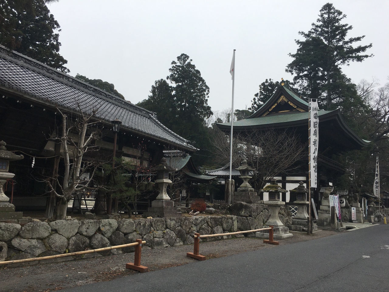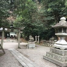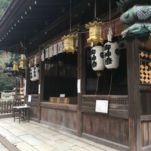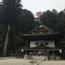 山の麓にひっそりとある神社としたが敷地が広く横長でした。社殿も門も木で出来ていて、古くさく歴史的を感じる建物でした。社殿には白い提灯がぶら下がり、能舞台のような建物もありました。道路沿いに灯籠が並んでいました。