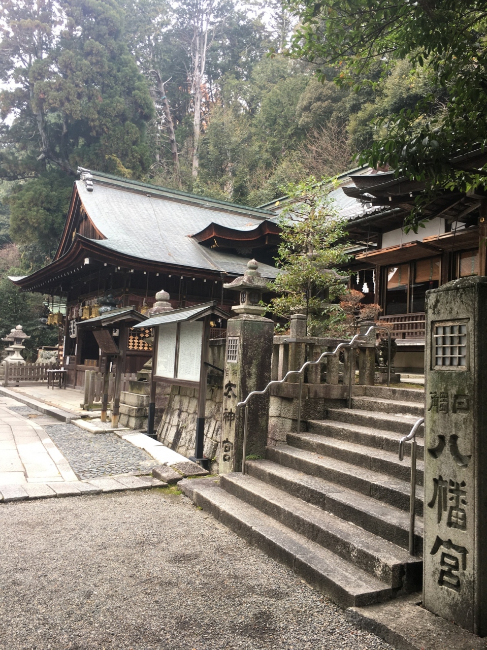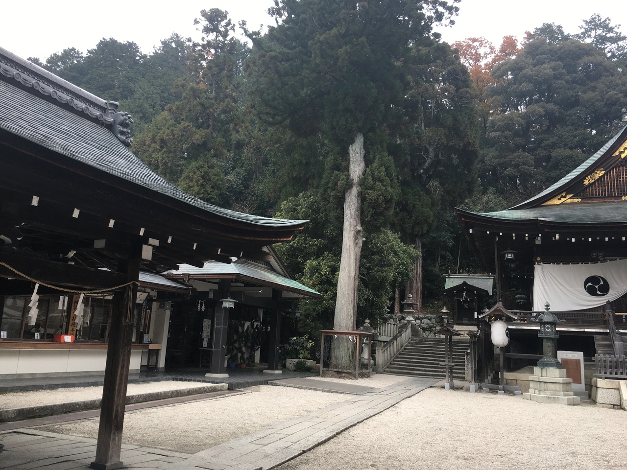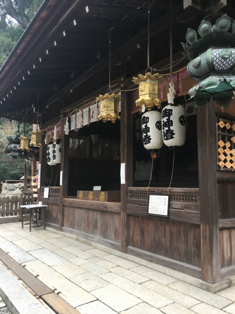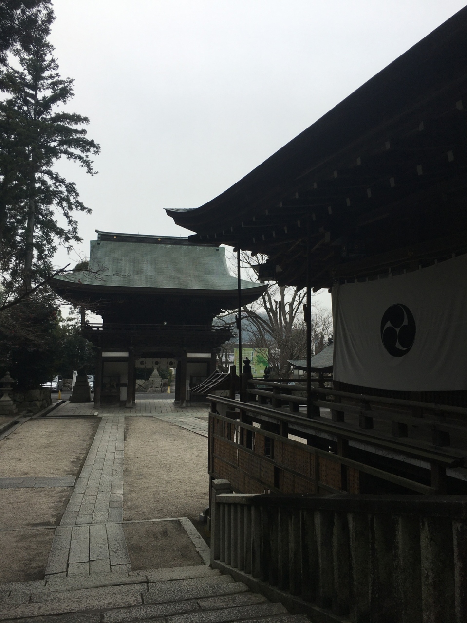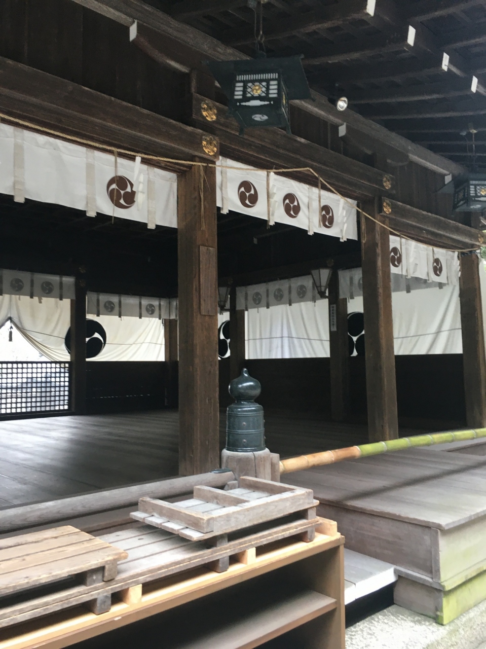山の麓にひっそりとある神社としたが敷地が広く横長でした。社殿も門も木で出来ていて、古くさく歴史的を感じる建物でした。社殿には白い提灯がぶら下がり、能舞台のような建物もありました。道路沿いに灯籠が並んでいました。