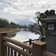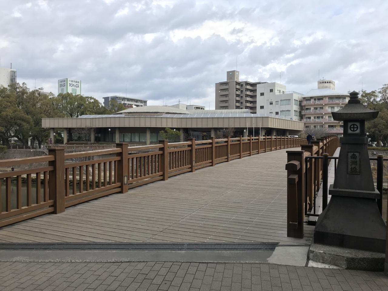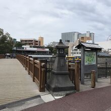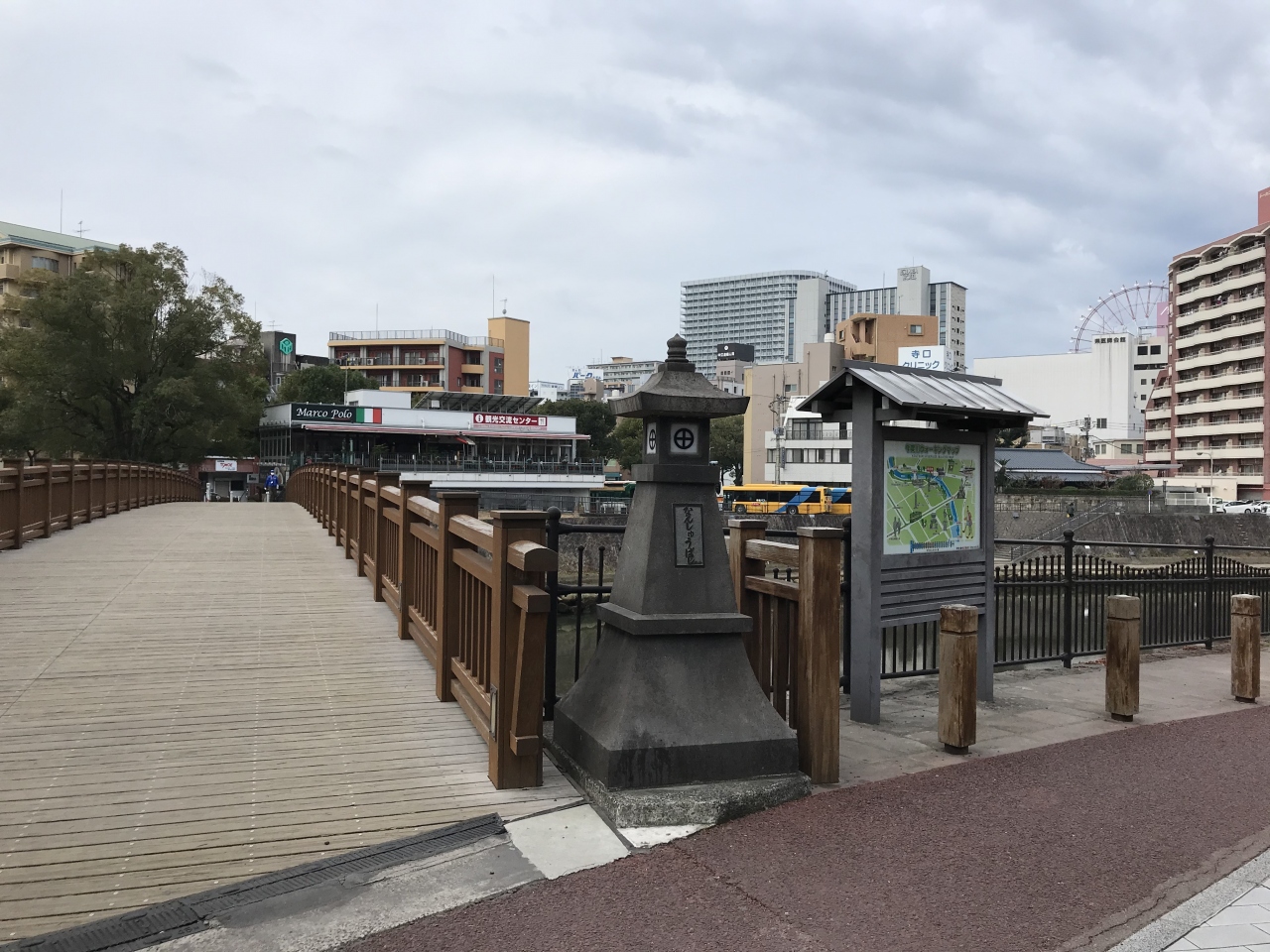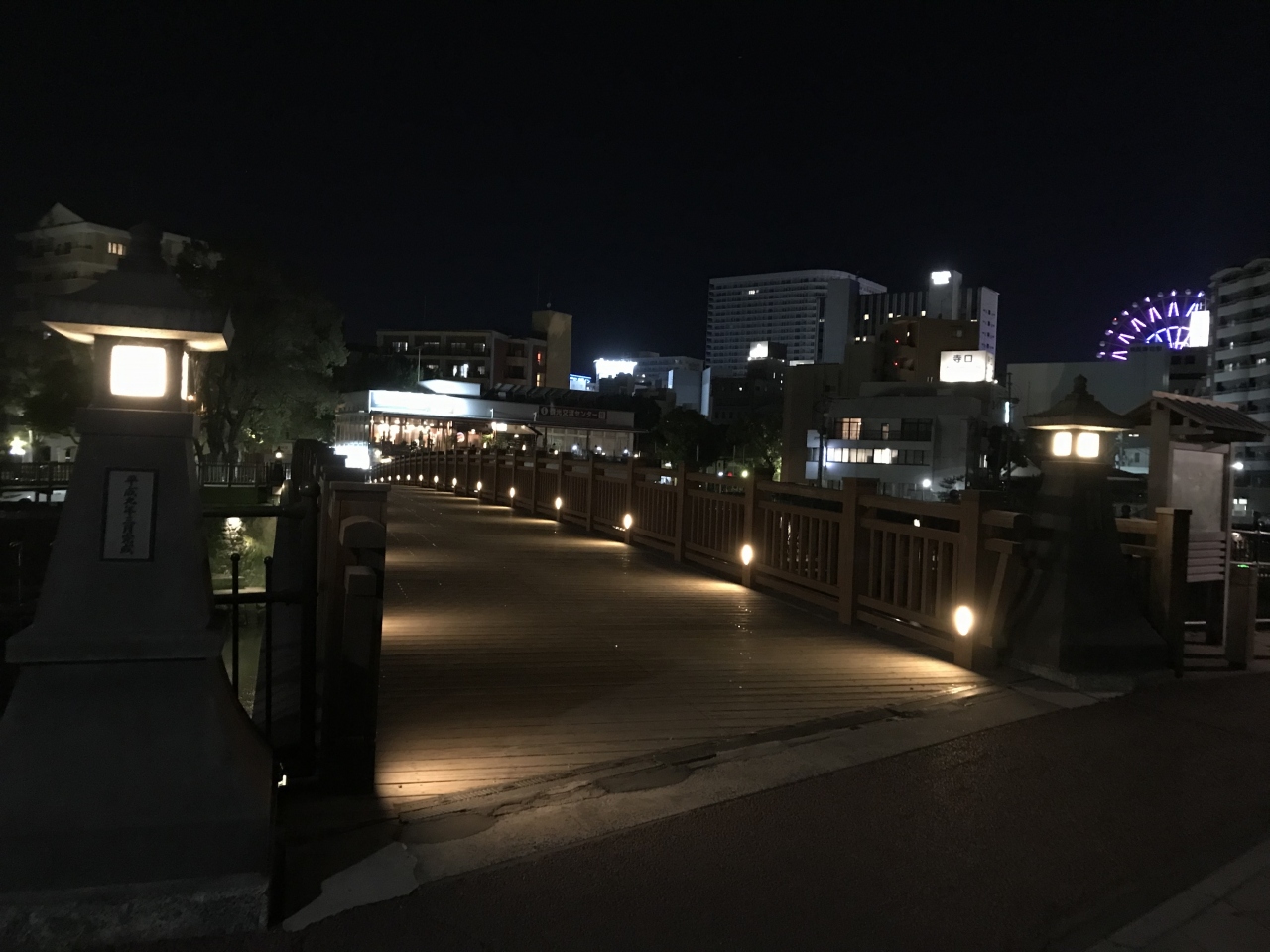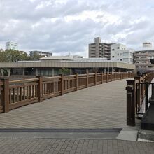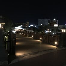 甲突川にかかる橋です。ちょうど維新ふるさと館の前に架かっています。川の反対側は観光交流センターです。歩行者専用の木造の橋で、橋の両端にある石の灯篭も趣があって良かったです。