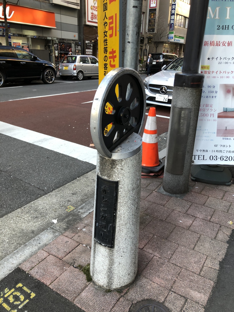 新橋駅の近くにある通りです。通りの両脇に並ぶのは、雑居ビルで、雰囲気は周辺の通りとあまり変わらなかったです。ただ、道路の一部にはレンガのタイルが敷き詰められていたり、新橋だけあって機関車の車輪をモチーフにしたオブジェがあったりと、所々に通りの由来を感じさせるものがありました。