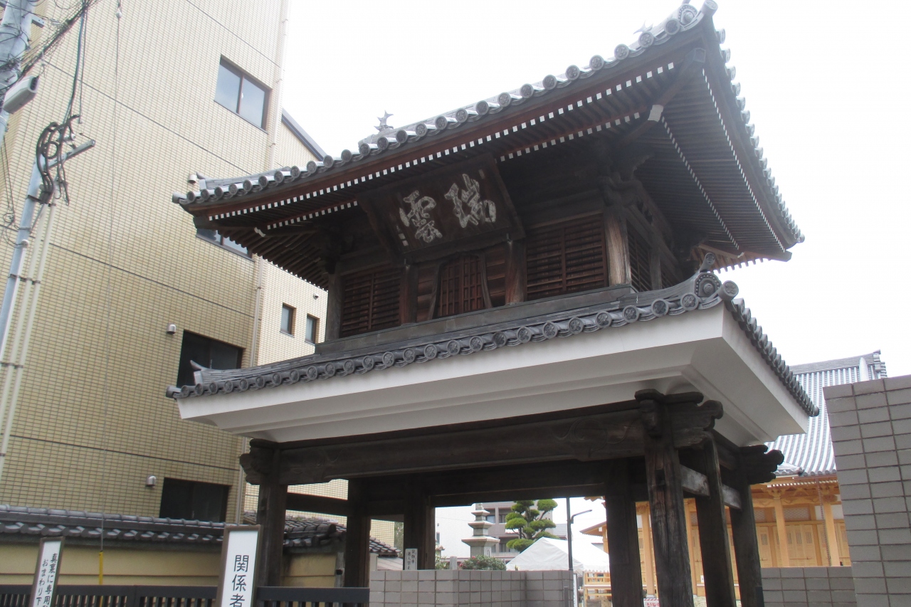 善龍寺は中央区唐人町にあるお寺さんです。黒門から城下に出た先が現在の唐人町商店街とのことですが、その正面に善龍寺の立派な山門がありました。そこに「関係者以外立入禁止」の立て看板がありました。本堂の建て替え工事中なので、規制をしていたのでしょう。ここは、1627年(寛永4年)に亡くなった如水の正室・光(院号は照福院)の火葬をした場所だそうです。庶民が住む場所には出来ないので、薬院の光専寺を開山した浄徳が、早良に庵を結んでいたので、米穀を与えて、ここに移させたのが、この寺の始まりとのことです。照福院の位牌は菩提寺の円応寺にありますが、このお寺にも位牌を置いているとのことです。山号は瑞雲山で、浄土真宗東本願寺派のお寺さんです。