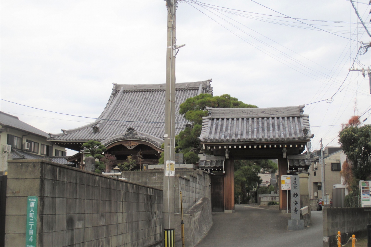 妙安寺は中央区唐人町にありました。吉祥寺の北にありましたが、山門が南向きで道路を塞ぐ様な位置です。結果、道路の方が山門を避けていました。このお寺が建てられる時は道路の突き当たりだったのだろうと思います。ここは警固にある香正寺の開祖・日延上人が、1660年(万治3年)に隠居して庵を結んだことが始まりです。この日延上人の養父は加藤清正です。また、昔は境内に清正を祀った清正堂があったそうですが、現在は失われています。なお、1719年(享保4年)にお寺領として土地を賜わり、妙安寺となっています。山号は海福山で、日蓮宗のお寺さんです。