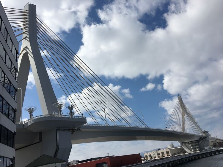 そもそも青森港周辺の交通渋滞を緩和するために建設されました。ツインシティの関係にある地元函館にも同様な橋があります。全車線供用開始は1994年。斜張橋なので見栄えがよく絵になる感じ。メモリアルシップ八甲田丸と港湾、さらに外観が特徴的なアスパムなどの他の建造物とあいまって青森港の印象的なビジュアルの一部になってます。