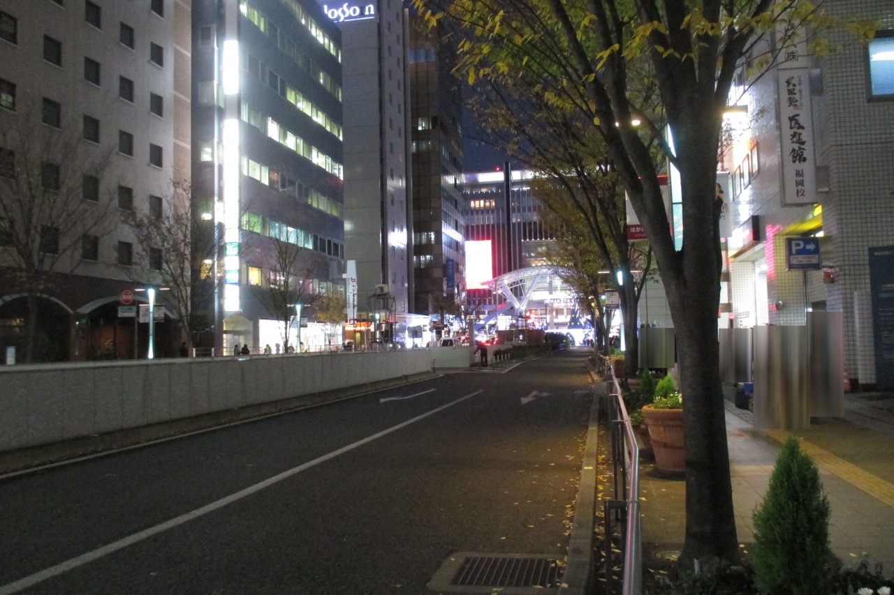 JR博多シティの明るいクリスマス・イルミネーションを楽しんだ後に、はかた駅前通りに進むと、歩道の照明灯は並んでいますが、イルミネーションで飾られている訳ではありませんから、その暗さを意識せざるを得ませんでした。振り返ると、JR博多シティのイルミネーションが一層明るく感じられました。