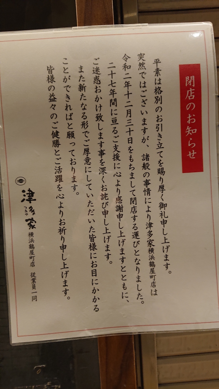 横浜市民なら利用したことは無くても名前くらいは耳にしたことがあるであろう、津多家。ちょっとした会合に便利な居酒屋ですが、いつの間にか鶴屋町店が閉店していました。これで残るは本店のみ。新宿の高野フルーツパーラーしかり、老舗が次々と閉店していくのは何とも寂しいですねえ。27年お疲れ様でした。