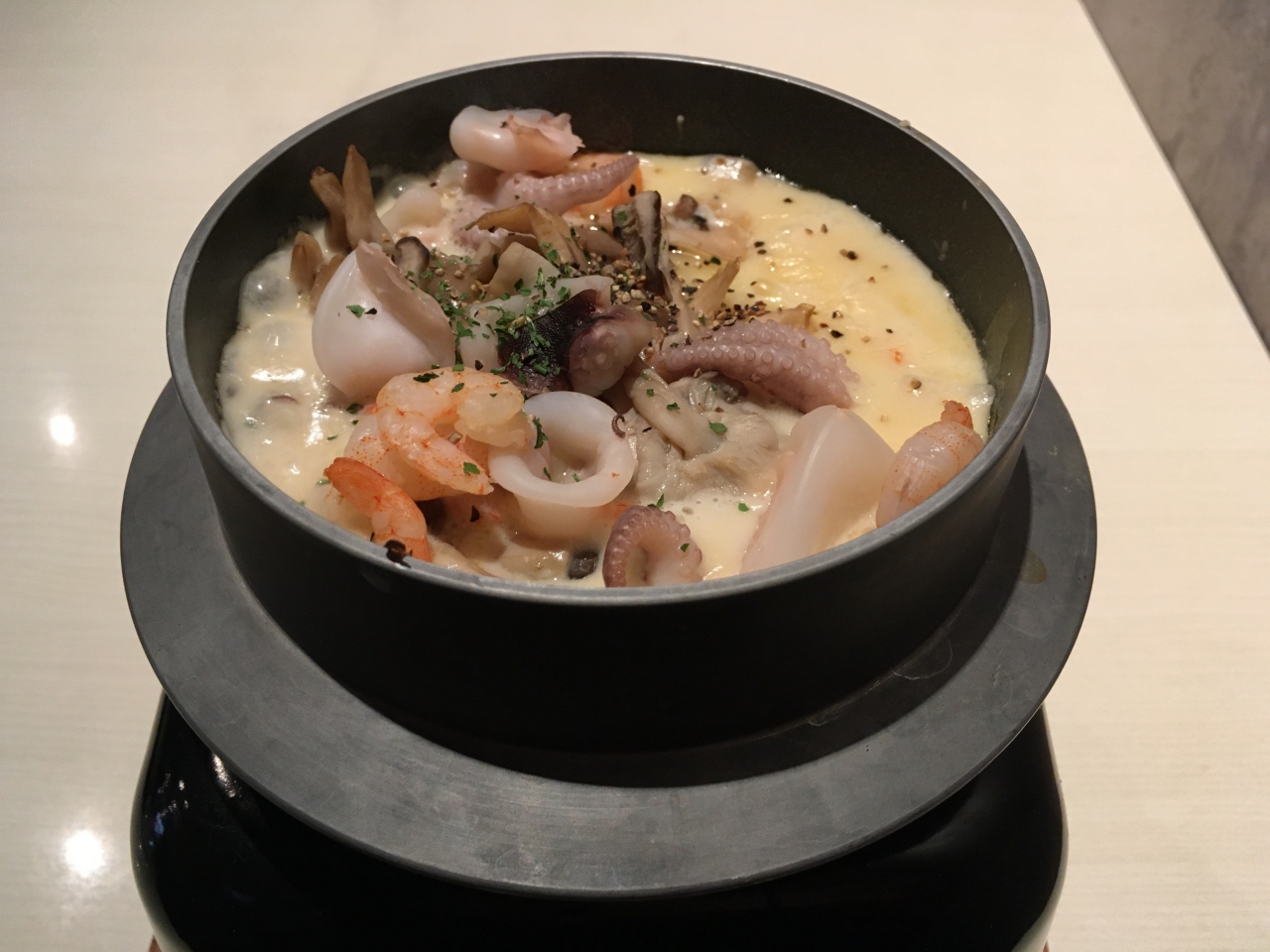 神戸三田アウトレットのフードコート内ではなく、店舗としてあります。落ち着いてランチできるので利用しました。メニューはハンバーグやパスタの他、リゾットが種類豊富にありました。海の幸のポルチーニリゾット、チーズフォンデュハンバーグを注文。リゾットはお釜で火が付いた状態で提供されるので、食べている間もチーズがとろけた状態で、最後はこんがりおこげまで楽しむことができました。食後に名物のチーズケーキを注文しました。食べ方が悪かったのかもしれませんが、すぐ食べないと固まってチーズとケーキが分かれた感じになり、美味しいという印象はありませんでした。