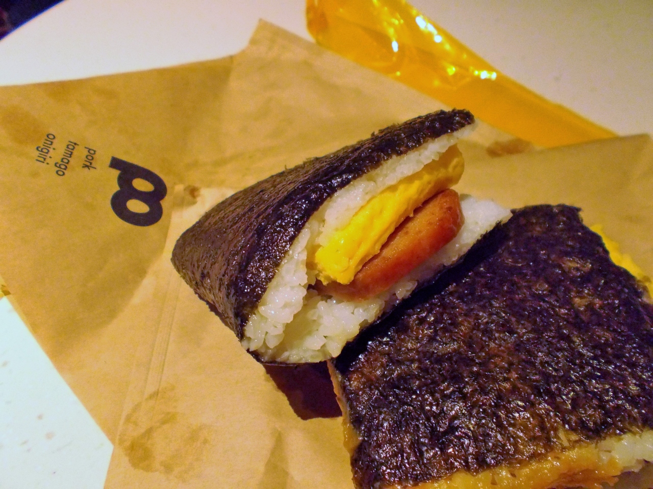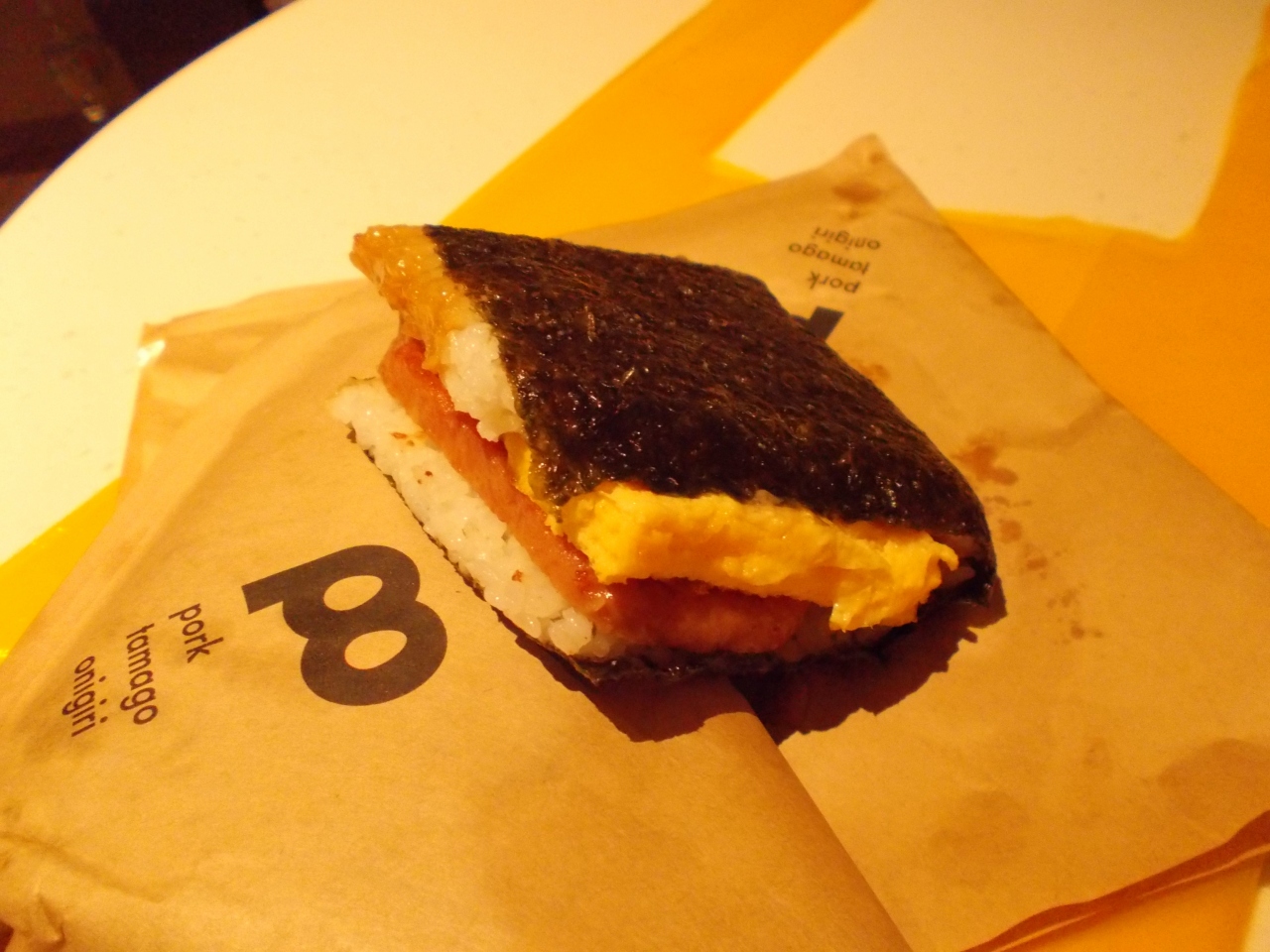 ポークはスパム、スパムとたまごをご飯で挟み、大きな海苔で巻いたお握り。