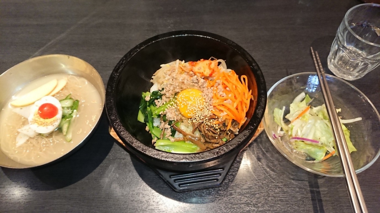 普段韓国料理はあまり食べないのでメニュー名がよくわからないので、知っている物を注文しました。石焼きビビンバと冷麺とサラダのセット。ちょっと勘違いしていて肉が入っているのかと思っていたので入ってなくてちょっとがっかりでしたが、そういえば肉が入っている物は石焼きユッケビビンバですね。。。石焼きビビンバも冷麺も美味しかったです。コロナ対策のためか長居はしないようにとの張り紙が貼ってありました。ササッと食べて店を出ました。価格もお得感がありました。注文はテーブルにあるタッチパネルの操作でした。