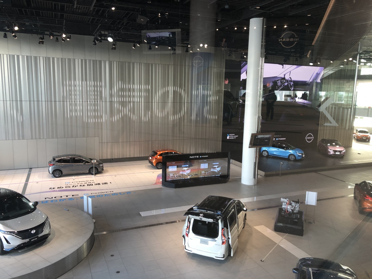 横浜駅東口から徒歩7分、横浜そごうから「はまみらいウォーク」を渡った先に、ギャラリーの建物があります。ギャラリーは全面ガラス張りになっていて、2階部分の通路(浜みらいウォークの先の入口を入ったところ)から、展示スペース(プロダクトゾーン)に並ぶ車を見下ろすことができます。