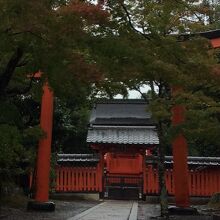 渡月橋北詰から大堰川沿いの道を西へ散策していたら、すぐの右側(北側)に赤い玉垣の車折神社嵐山頓宮が見えた、車折は“クルマサキ”と読むらいい、頓宮は別社で、本社は別の所、京福電車車折駅からすぐの所にあるそうです