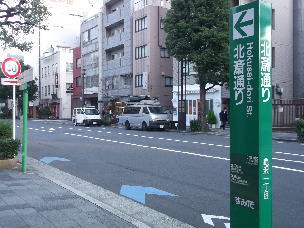 地下鉄両国駅の前から緑町公園の方に東西に延びる大通りです。葛飾北斎の生誕地が近くにあることからこのように名付けられた通りで、緑町公園には北斎美術館もあります。公園からさらに進んでいくと相撲と縁のある野見宿彌神社もあり、歴史の一コマを説明する案内板をたどりながら散策を楽しめます。