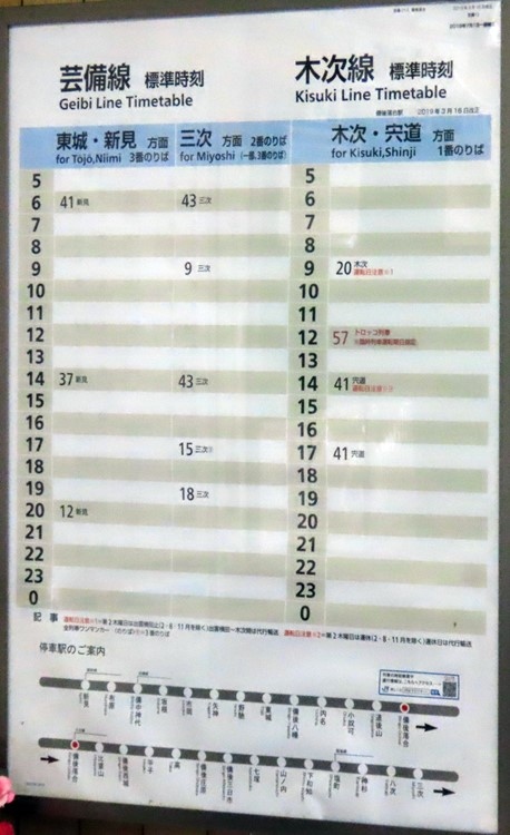 中国地方の内陸線の乗りつくし旅で完乗しました。岡山県備中神代から広島駅まで東西90キロほどのローカル線。東側は伯備線を経由して新見駅まで乗り入れています。木次線を完乗する都合上、分割して「備後落合~広島」「新見~三次」という重複区間のある乗車をしました。すべての列車は備後落合で乗換えになりますが、さすがにここの時刻表には感動。新見方面へ1日3本、三次方面へ1日5本、木次線の宍道方面へ1日3本。すべて折り返し列車で通過列車ゼロというのがユニークな駅でした。同じ芸備線でも広島に近くなるほど「1時間に上下各3本」という時刻表も珍しくないことを考えると日本一格差の大きい路線かもしれません。