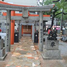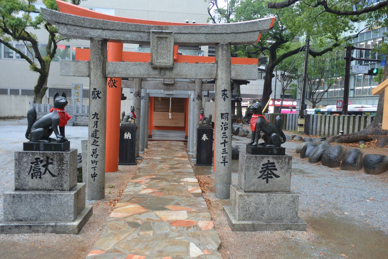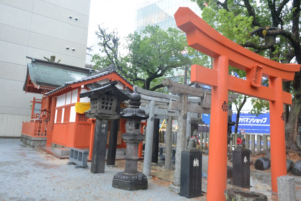 警固神社境内にある稲荷社です。社殿は比較的新しそうで、鳥居は古い物もあれば新しいしのもありました。おきつね様が4体いらっしゃって、そのうち2体は「笑いきつね」で、撫でて帰ると、福がついてまわるそうですよ。