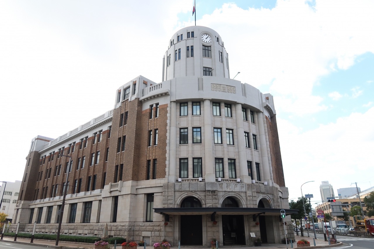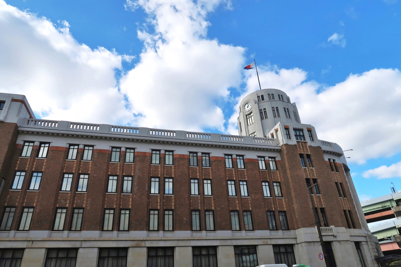 東遊園地のこうべ花時計からすぐのところにあるレトロ建築です。交差点に面して曲線を描いている正面玄関には、銀行建築のような4本の列柱が並び、その上に3つの時計を配した円筒形の時計塔がありました。時計塔の上で風にはためく税関旗も、使い古されてレトロな状態となっていました。