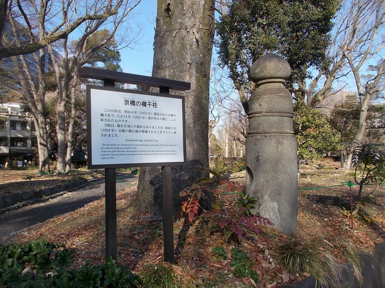 この日比谷公園京橋の欄干柱は公園内の北西のエリアにある雲形池の北側にあります。石の欄干です。今は1本のみ公園にあります。この欄干は明治8年に京橋ができたときに造られたもので大正時代にかけかえられたときに置かれたものです。今はひっそりとして石柱として残っています。