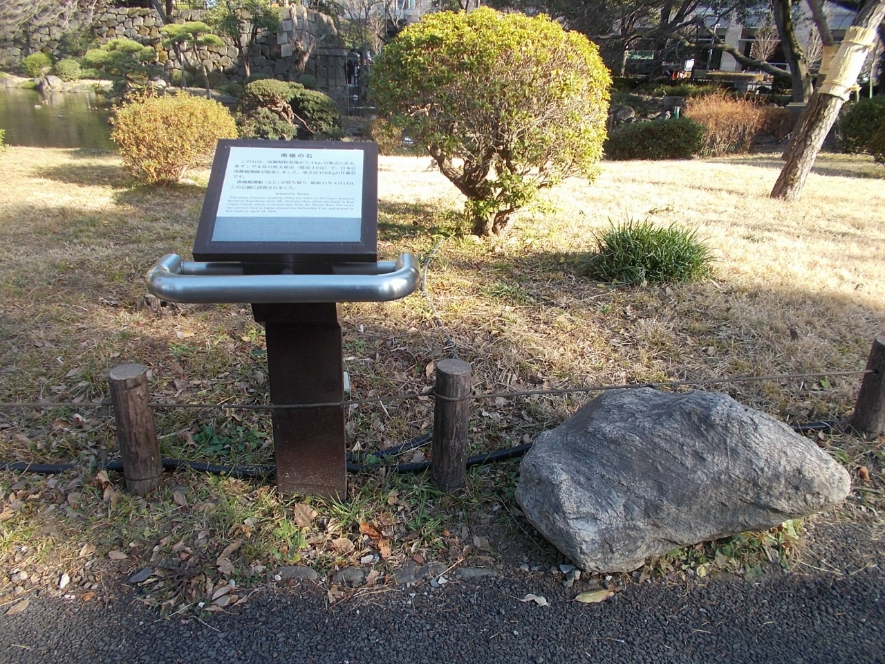 この日比谷公園南極の石は公園の南東にある心字池の北側にあります。大きな石の脇に説明板があります。この石は南極の東オングル島からふじが持ち帰ったものです。昭和41年に公園に置かれました。重さが150kgです。南極に石があることまた重さにもびっくりです。