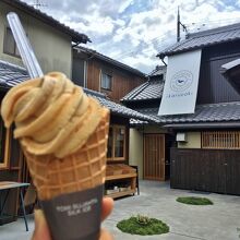 少し変わった店名です。「ikarucoki(イカルコキー)」は、斑鳩の地名由来にもなった鳥“イカル(鵤)”の鳴き声を文字で表したものだそうです。奈良・斑鳩産の特産品を扱うお土産店で、お菓子や手ぬぐいなど雑貨が多く並んでいました。法隆寺参拝前に併設されたカフェこもどでランチ休憩をし、参拝後に再び立ち寄ってランチのサラダで使われていた黒人参ドレッシングを購入しました。生キャラメルソフトクリームも注文し、綺麗に改装された施設内で休憩しながらいただきました。