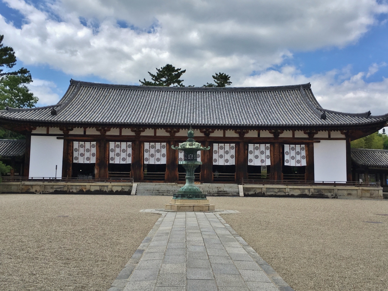 金堂と五重塔の北側に僧侶たちが学ぶ場として建設されました。925年に焼失し、990年ほぼ元の規模と同じ大きさで再建、回廊を延長して接続されました。法隆寺最大の建物で、どっしりと貫禄があります。堂内には再建時に新たに造像された薬師三尊像と四天王像が安置されています。大講堂からは金堂、中門、五重塔が並んで見えて、とても素晴らしい光景です。