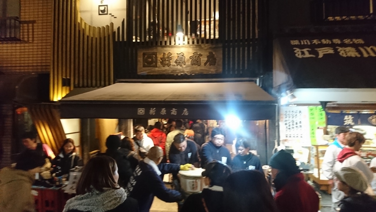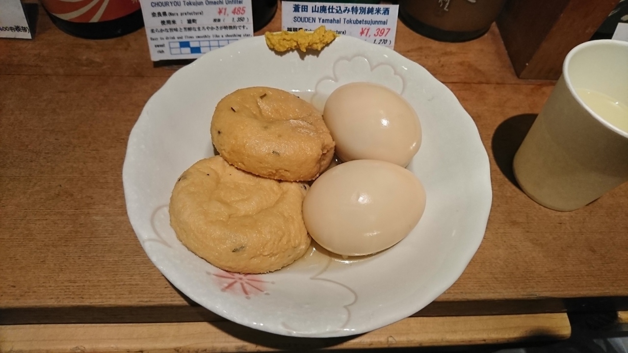 門前仲町駅からすぐ、深川不動尊の参道の途中にある立ち飲みのできる酒屋さんです。2020年1月、富岡八幡宮への初詣の帰り道に立ち寄り、がんもどきとゆで卵のおでんと日本酒をいただきました。狭い店内ですが、立ち飲みのお客さんで超満員。日本酒の種類も豊富で、その場でグラスでいただけるので日本酒ファンの方の常連さんが多いようです。