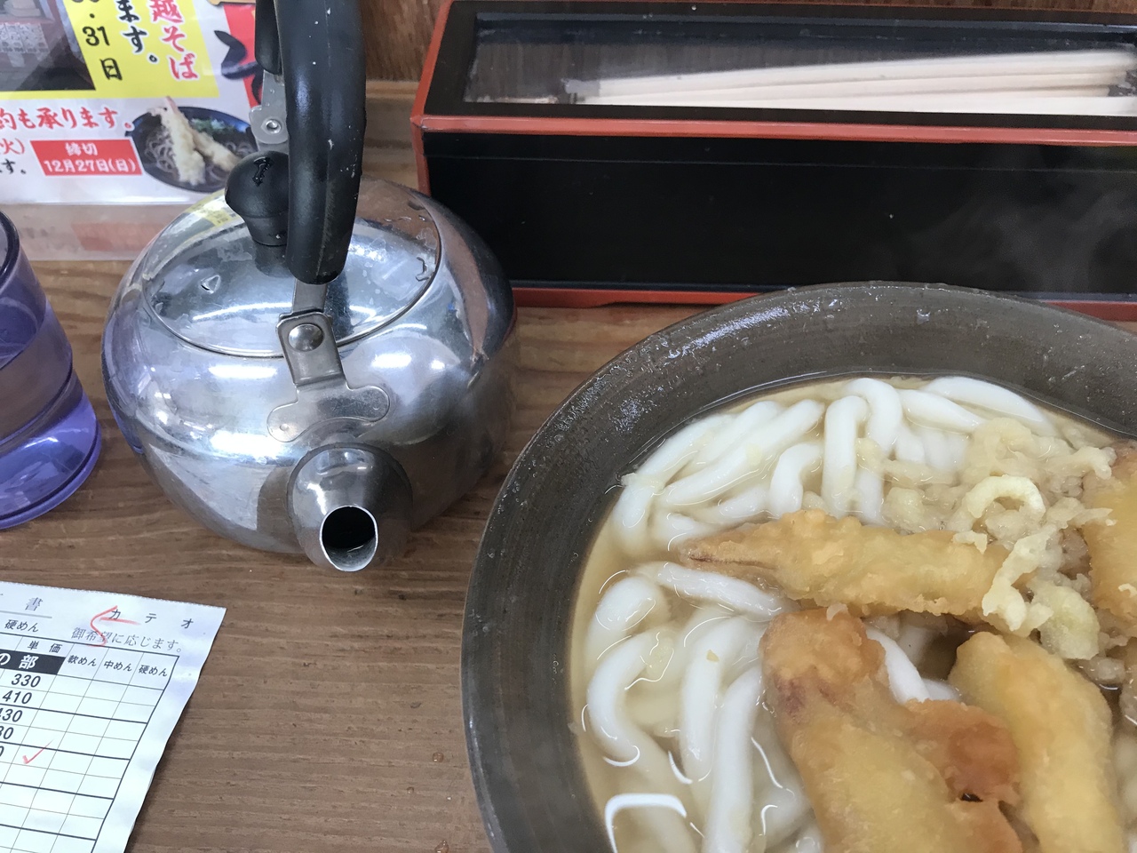入れ放題の葱を入れて、うどんを食べるとうどんからもお出汁の味が広がる。結構な勢いで出汁が減っていく(要は吸っていく)ので、スープが少なくなったらやかんからかける。それが結構楽しい。
