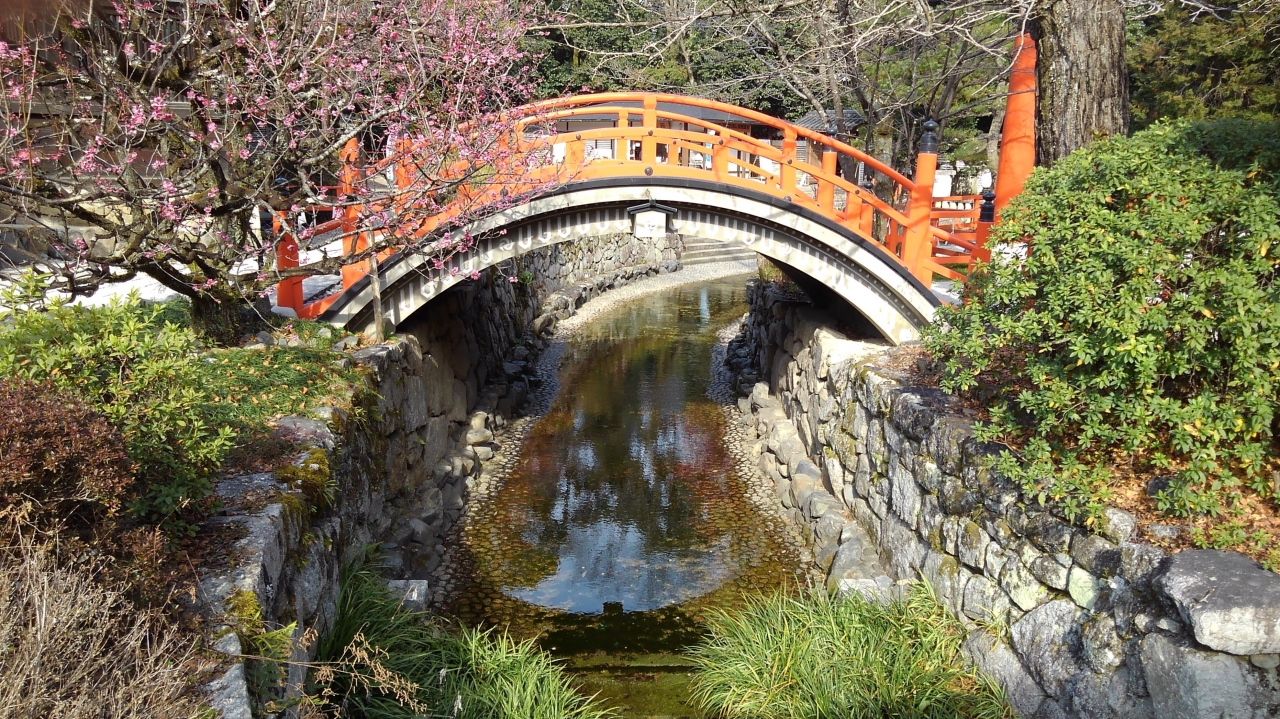 近くの輪橋(そりはし)と光琳の梅がとても美しく、御手洗川の流れに映えていました。