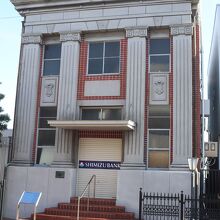 旧東海道の由比宿沿い、由比本陣公園のほぼ向かいにある建物です。1925年建築、鉄筋コンクリートの2階建て、正面の柱が印象的な古代ギリシャ様式を取り入れた昭和初期の銀行建築です。今も現役の銀行出張所です。