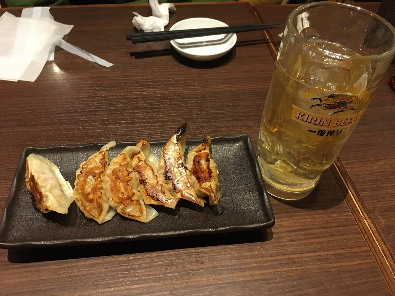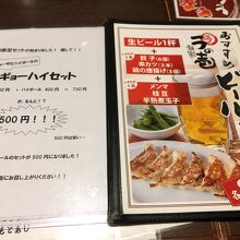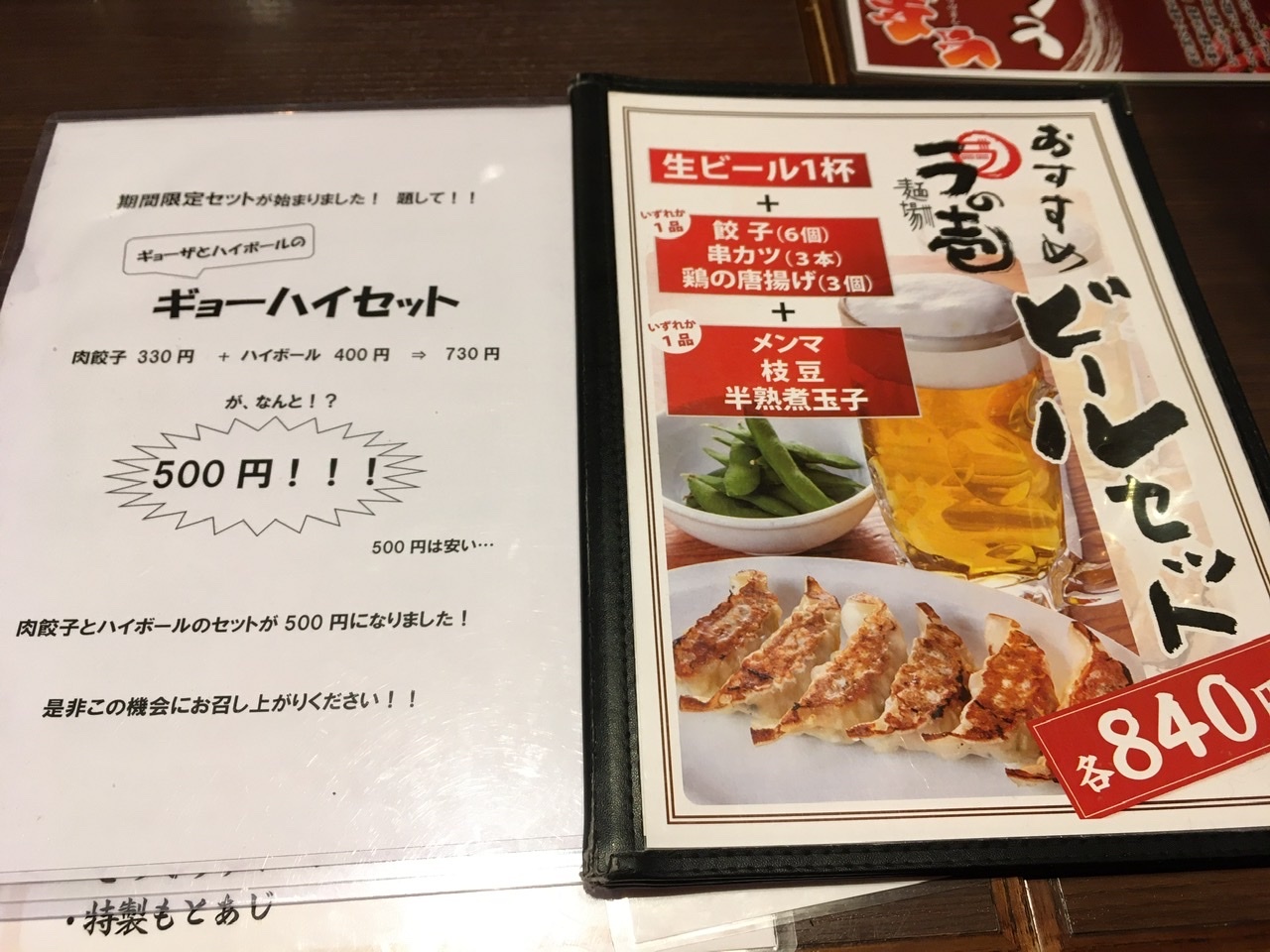 周囲の店も1000円程度で飲み食いできるチョイ飲みメニューを設定しているためか、ラーメンが本業のこの店でも、餃子とハイボールで500円と言うギョーハイセットと生ビール+一品料理2品のセットを頼みました。
