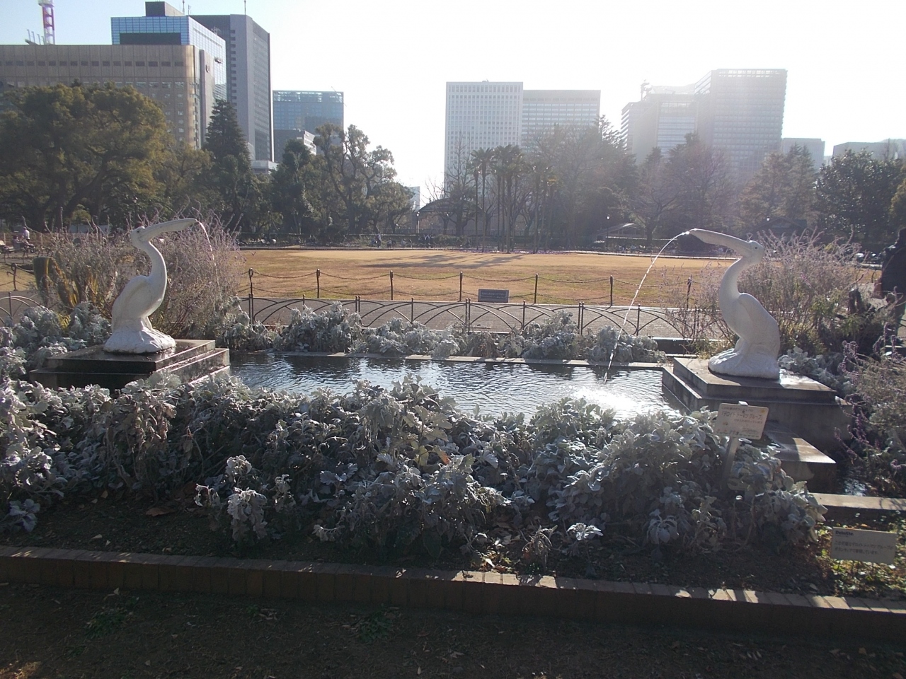 この日比谷公園第一花壇のペリカン噴水は公園の東側にある第一花壇の東端にあります。二羽のペリカンがお互いに向き合って口から噴水しています。その姿は夫婦のような印象です。この噴水越しに第一花壇とその奥に小音楽堂があり見ごたえがある場所です。