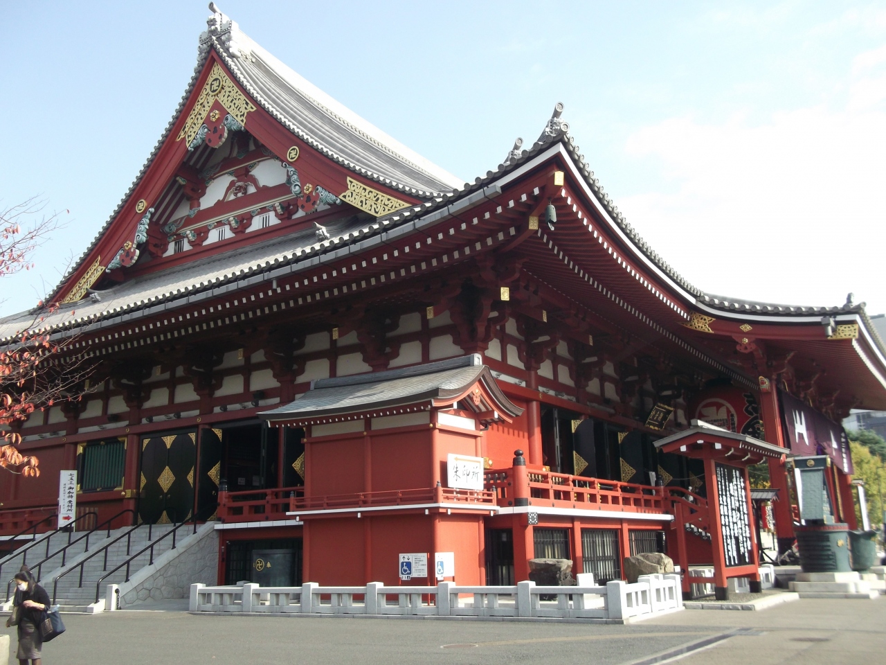雷門をくぐって仲見世通りを進み宝蔵門を通り抜けると、立派な造りの浅草寺本堂が目の前に見えてきます。現在の本堂は東京大空襲で焼失後の昭和30年代に再建された建物で、平成20年代の大営繕でさらにきれいになりました。色鮮やかな朱塗りの柱と芸術的な曲線美の屋根には目を見張るものがあります。