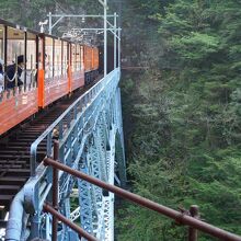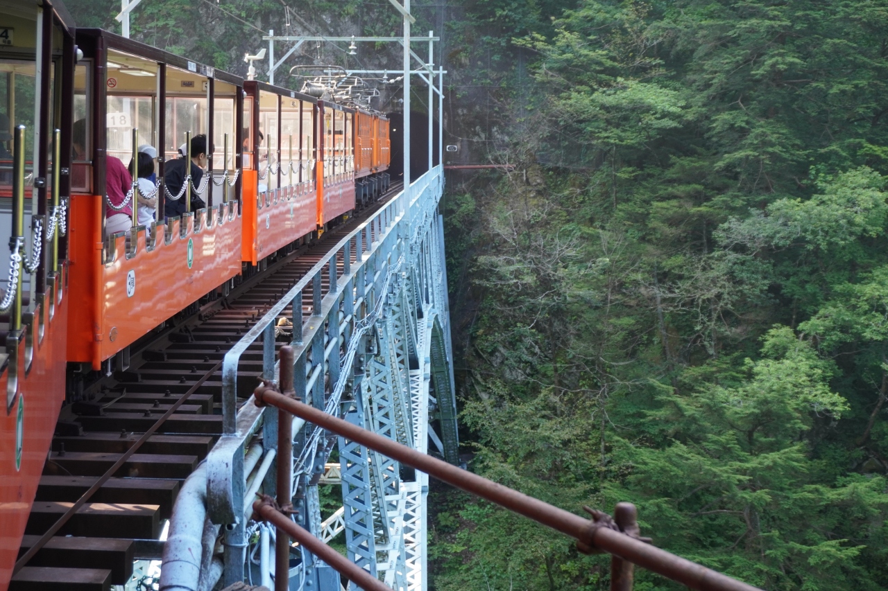後曳橋は、黒薙駅を過ぎてすぐに渡る淡いブルーの鉄橋。カーブになっているので、青い鉄橋を進む赤い黒部峡谷鉄道の赤い車両のコントラストもなかなかいいかな。鉄橋を過ぎるとすぐにトンネルなので、深い谷底を見るのは一瞬です。