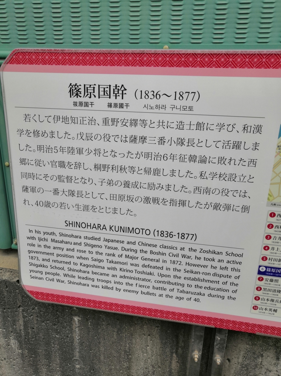 鹿児島中央高校の南側に石碑と説明文があります。西南戦争のときの薩軍の一番大隊長だった人物です。それだけだといかにも軍人さんという感じですが、私学校設立の際には子弟の教育にもあたったそうです。わかりやすい説明文でした。