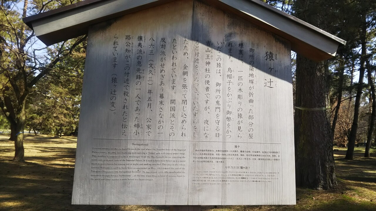 こないだ御苑の中見たとき見逃してたのでまた撮影に。御所の築地塀がおり曲がった部分の屋根裏に木彫りのさるがあるらしい。そのサルは夜中になったらいたずらしたから閉じ込められてしまったとのこと。それでちょうどこの位置が姉小路公知が殺された場所でもあるよということ。