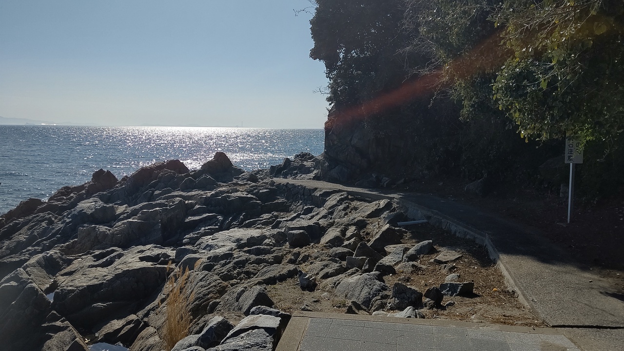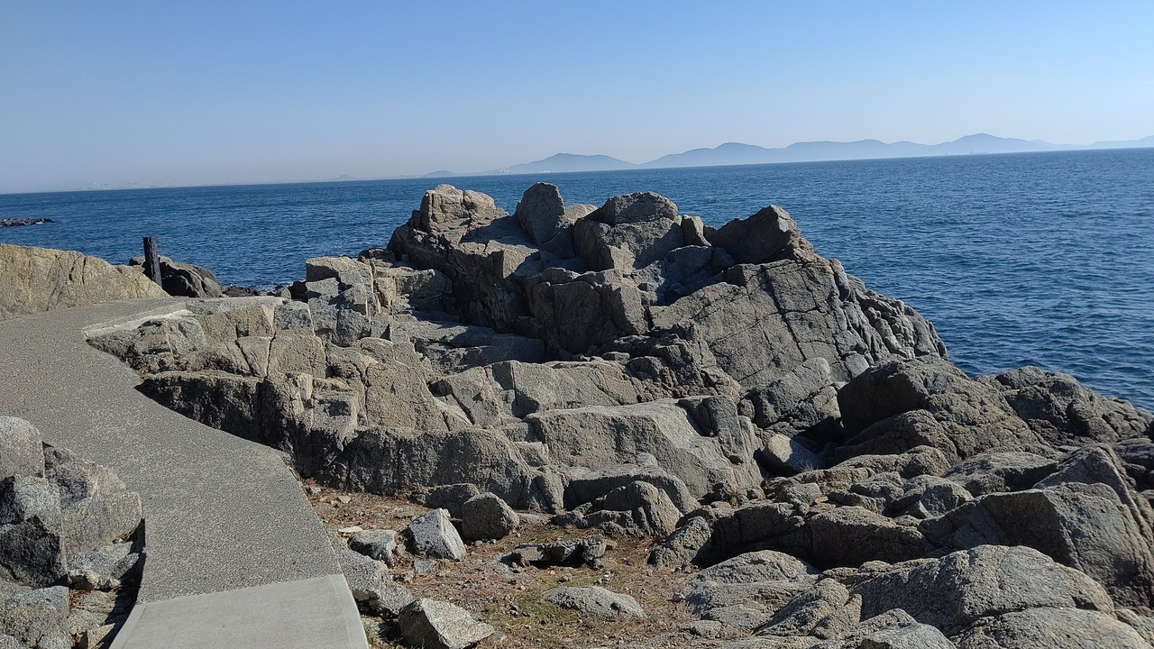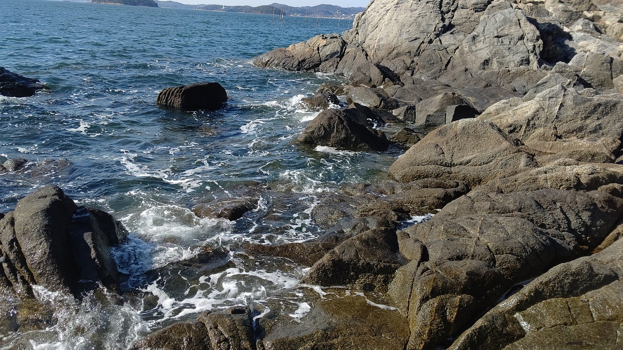 海岸沿いの道路を車で走っていると三河湾が迫ってきて圧巻です。また歩いても、海水浴場からは海沿いに遊歩道が伸びていて(橋田鼻遊歩道)、ごつごつした岩に魅了されました。バリアフリーは途中から階段があって難ありです。