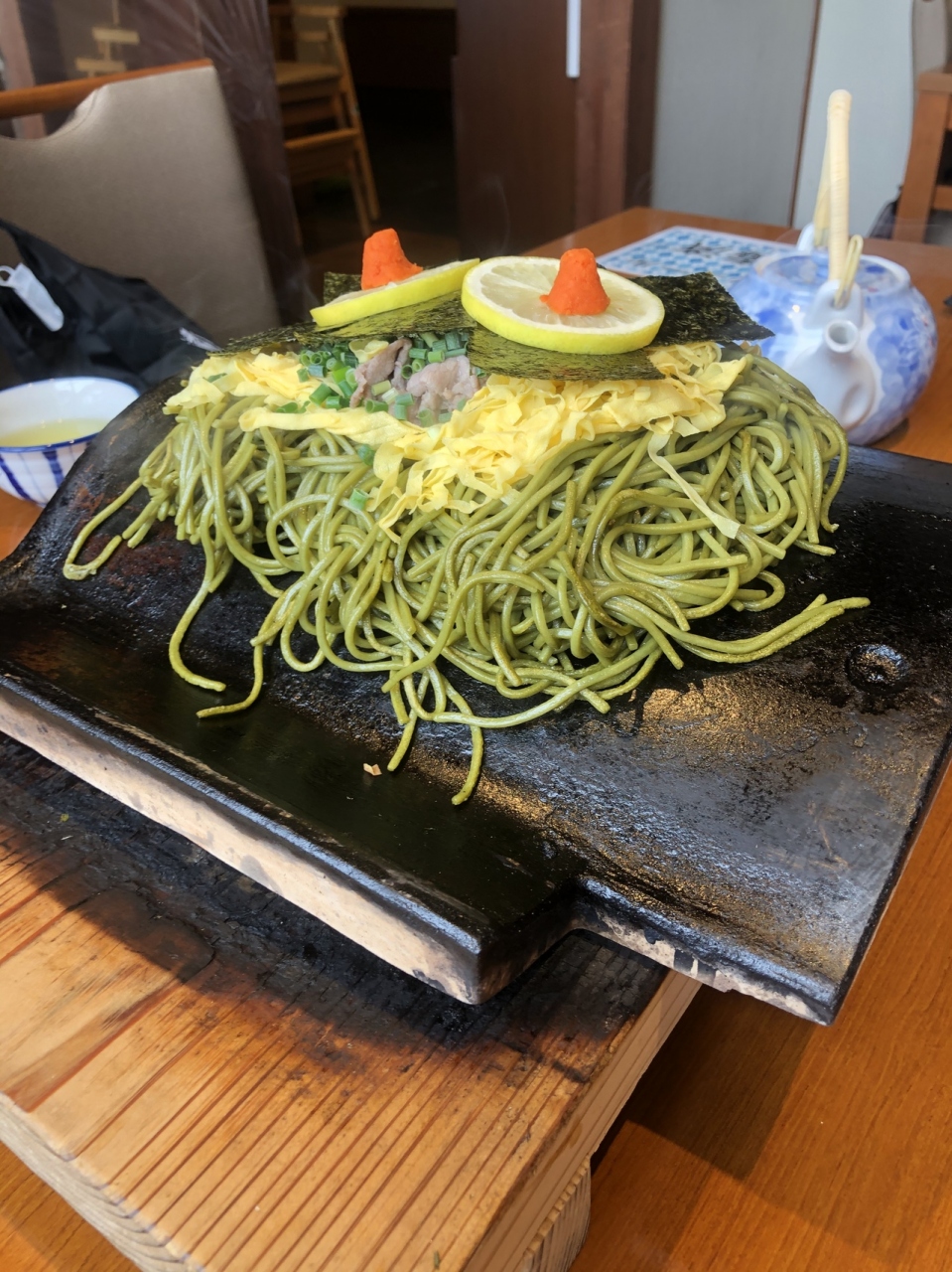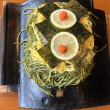 山口県が発祥の瓦そばですが、こちらが元祖らしいです。そして門司港レトロでも食べることができます。瓦の上にのってくるのは茶蕎麦と錦糸卵や甘辛く味付けされたお肉です。それをつゆにつけて食べます。おそばが瓦の上で焼かれてくるので最後の方はカリカリしてまた美味しいです。