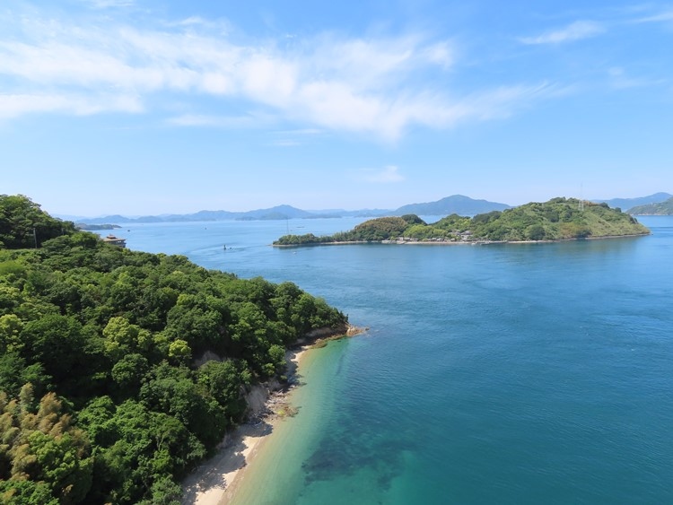 「こじま」じゃなくて「おじま」でした。もう少し小さい島なのかとは思い込みでした。来島海峡大橋の橋梁が乗っかっているのが馬島で、その西北側にあります。かつてはここに芸予要塞が築かれていたそうです。橋の上から見ていると馬島・小島の間を船が通り抜けていきました。
