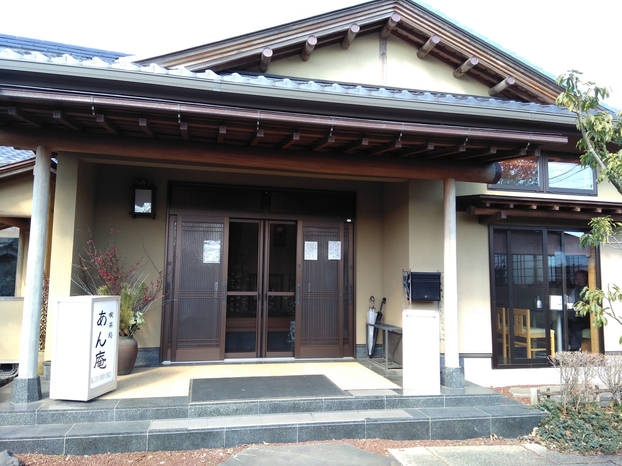 408号でつくばの「肉のハナマサ」を目指し、ハナマサの信号で右折、道なりに進んだ住宅街にお店はあります。お蕎麦が美味しいと行きましたが、看板は喫茶処あん庵となってました。木戸をくぐると見て下さいと言わんばかりの庭が見られます。テーブル席にしましたが広いお座敷席もあり、お座敷の方が眺めも良い感じです。
