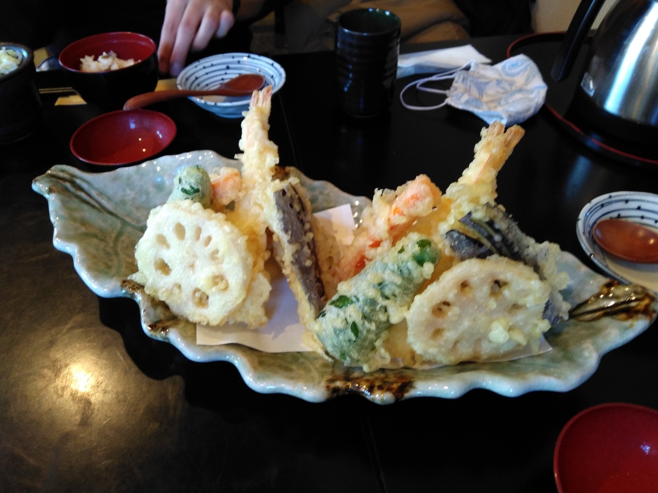お蕎麦はへぎ蕎麦、渓流蕎麦の2種類で娘と両方食べられるメニューにしました。最初に抹茶と羊羹や煮卵、漬物のお茶請けのようなものが出され、炊き込みご飯、天ぷら、2種類のお蕎麦、ぜんざいのセットで食べ応えありました。ちょっと残念だったのは早い時間にぜんざいが運ばれ冷めていたことです。冬のぜんざいは熱々が好きなので次に行ったら後でと言うつもりです。