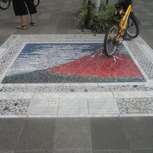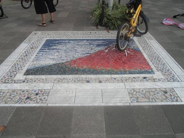 説明板近くの地面に、タイルで描かれた赤富士の絵はあり、なかなか良い出来です。