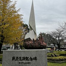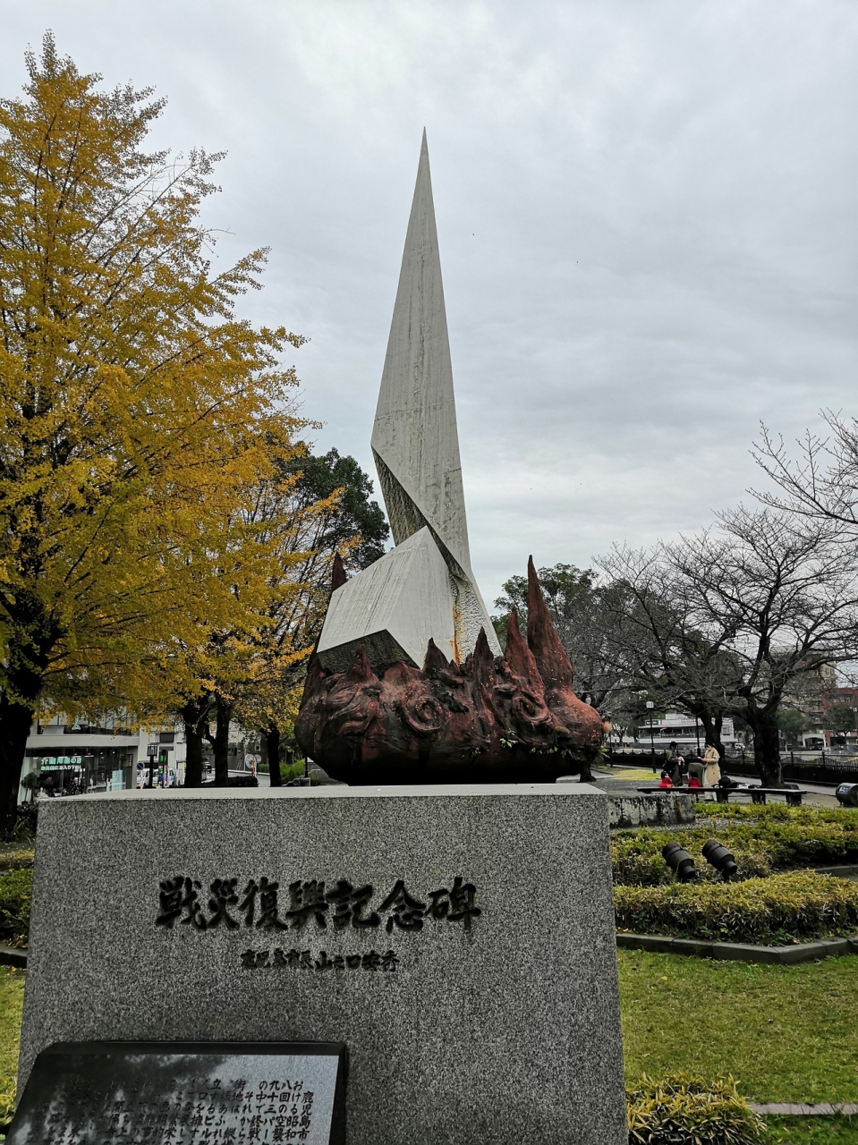 高見橋の東側に南東方面に伸びていく緑地がありますが、その一角にあります。鹿児島には初めて来たので知らなかったのですが、第二次世界大戦では実に市街地の93パーセントを焼失したそうで、その復興を記念した碑です。なかなか印象的なデザインでした。