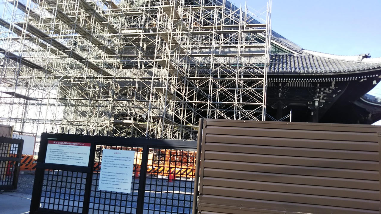 七条堀川を西行ったとこにお知らせでてた。大阪北部を震源とする地震や台風の影響で2018年7月から御影堂の入場禁止になってる。2018年かぁ。結構たってるように感じる。確かにあのときの台風はきつかった。他にも京都市内で被害出てるとのこたくさんあったからね。