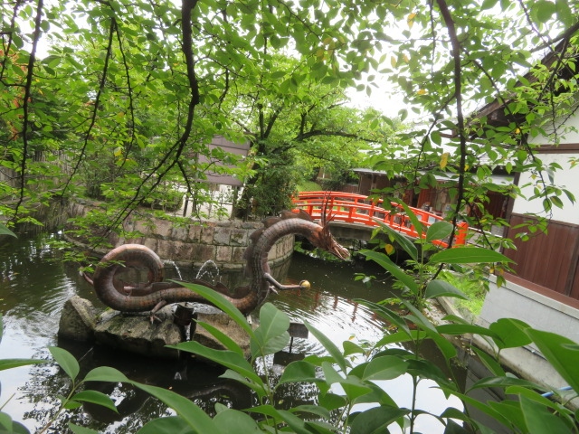 こちらのお寺には、新選組にまつわる逸話が多いお寺です。珍しいところで「夜啼き地蔵」というお地蔵様がおられるので、夜啼きにお困りの方はどうぞ。あとこちらは、太鼓橋の架かった池の風景が素敵です。守り神の龍が迫力です。