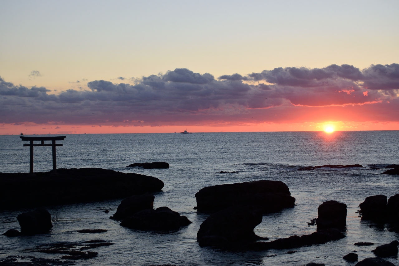 茨城県の大洗にある大洗磯前神社は、社殿は丘の上にありますが、鳥居の一つが海の中にある初日の出人気のスポットです。初日の出でなくても日の出の時間はいつも混雑しており、日の出の瞬間を写真におさめようと多くの写真家が訪れています。