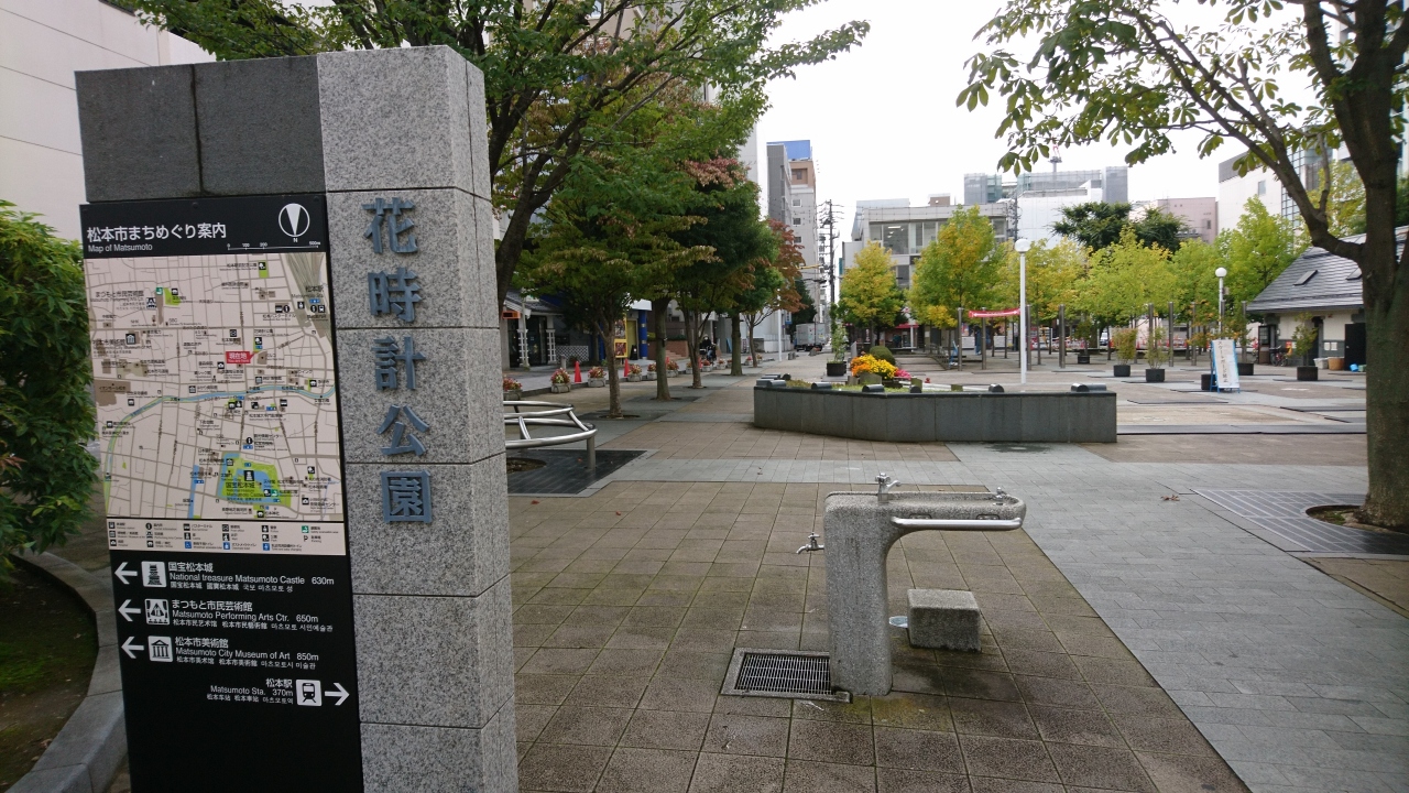 松本市の中心部にある公園です。中央西公園というより、花時計公園という呼び方が浸透しています。公園の中心に花時計があるからです。近くにはパルコや郵便局などもあり、町のオアシスといった感じです。買物の途中に立ち寄ったりできる憩いスポットです。