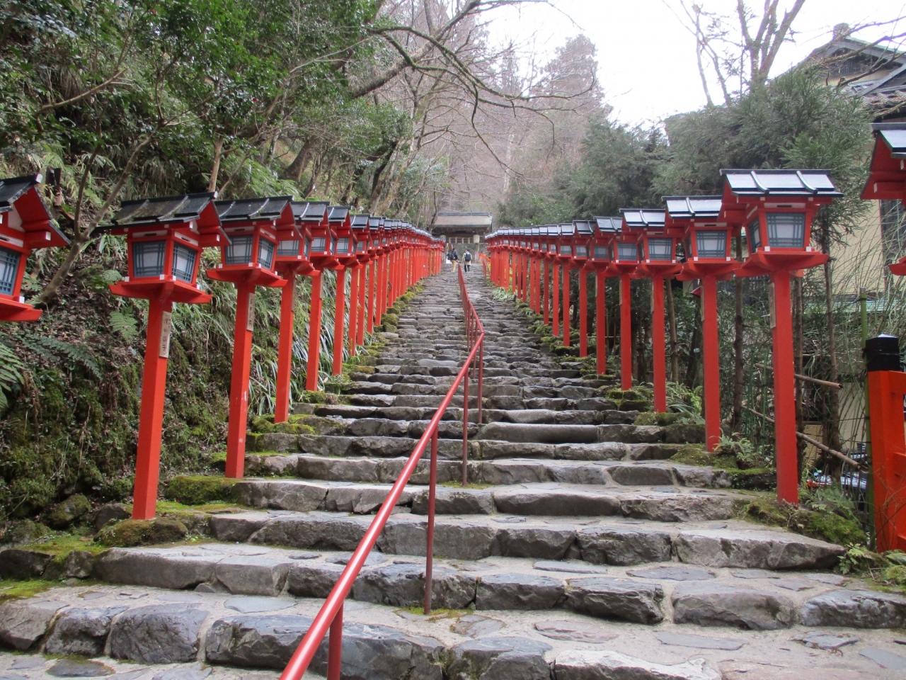叡山電鉄の市原駅でバスに乗り換えて、貴船神社へ行きました。鴨川の水源地にまつられ、古くから水の神、縁結びの神として崇敬を集めています。本殿へ続く石段の参道は、両脇に赤い灯篭が立ち並び、有名なスポットです。石段を上がって本殿に行きました。こちらでは水占いが有名です。私もしました。