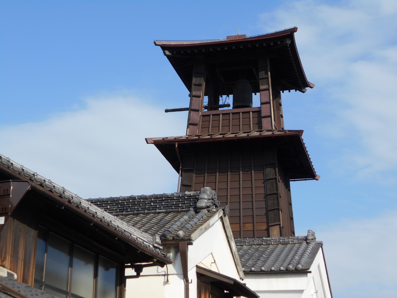 毎日、午前6時・正午・午後3時・午後6時の4回時を知らせてくれる「時の鐘」。木造の3層の櫓は高さ16メートル、江戸時代初期から時を告げてきたそうです。蔵造りの町並みと時の鐘は小江戸と呼ばれる川越のシンボル的存在で城下町の面影を色濃く残しています。