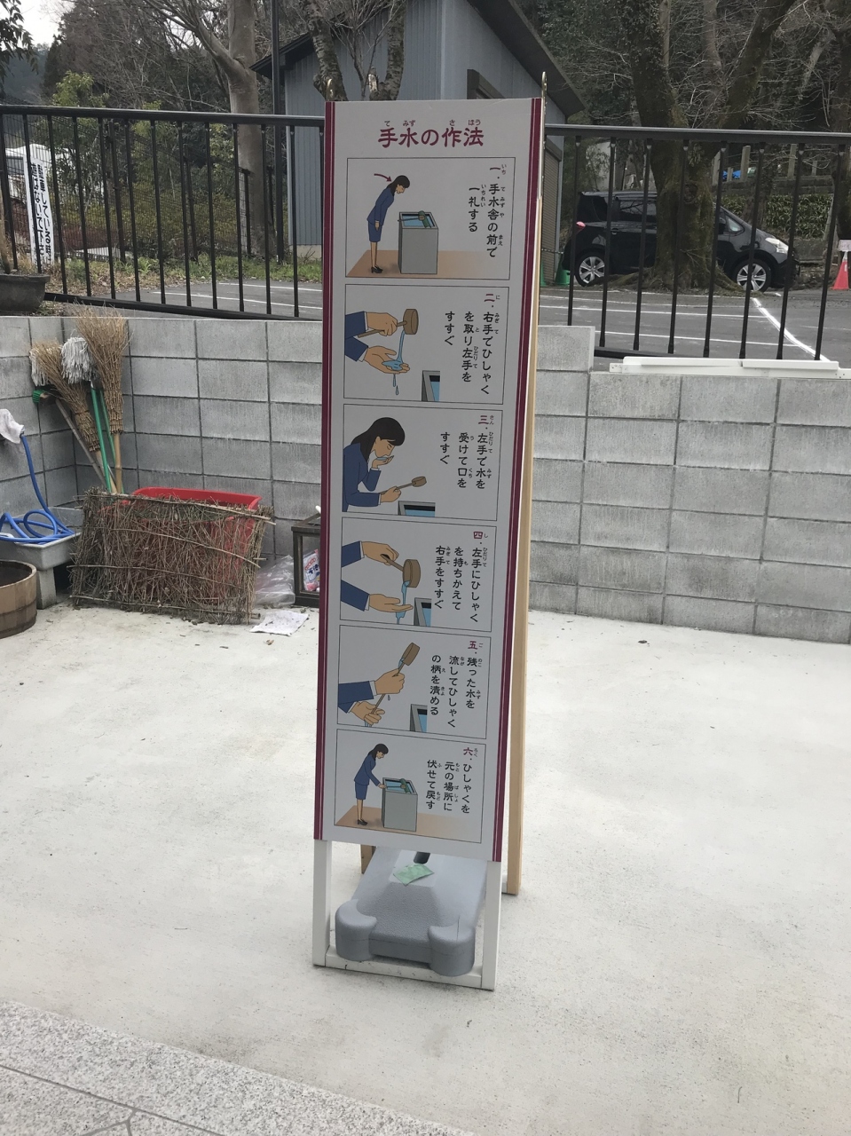 神社の手前には手水舎があり、そこで清めてから大鳥居をくぐり、拝殿する流れ。手水舎には作法がイラストで描いてありわかりやすい。