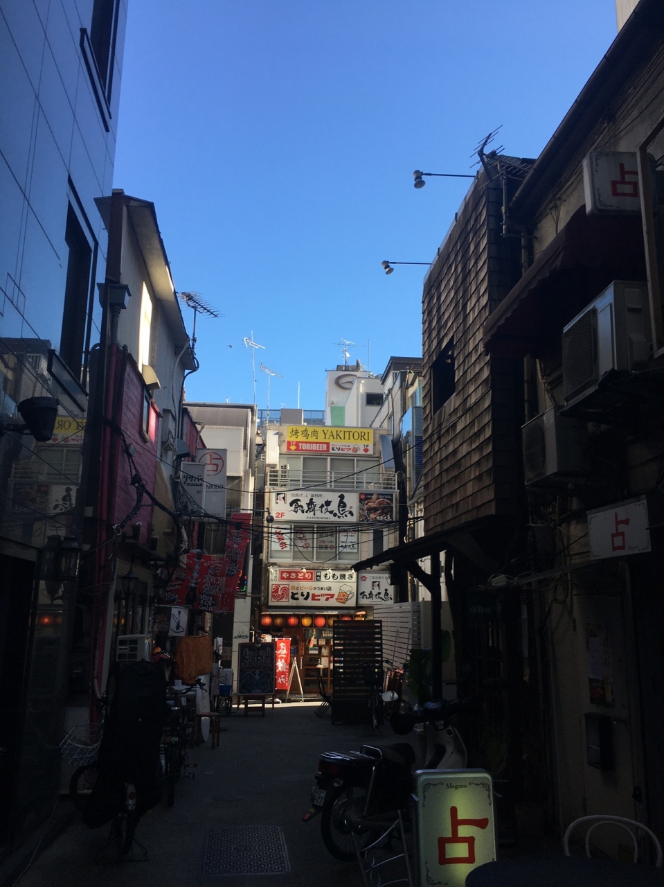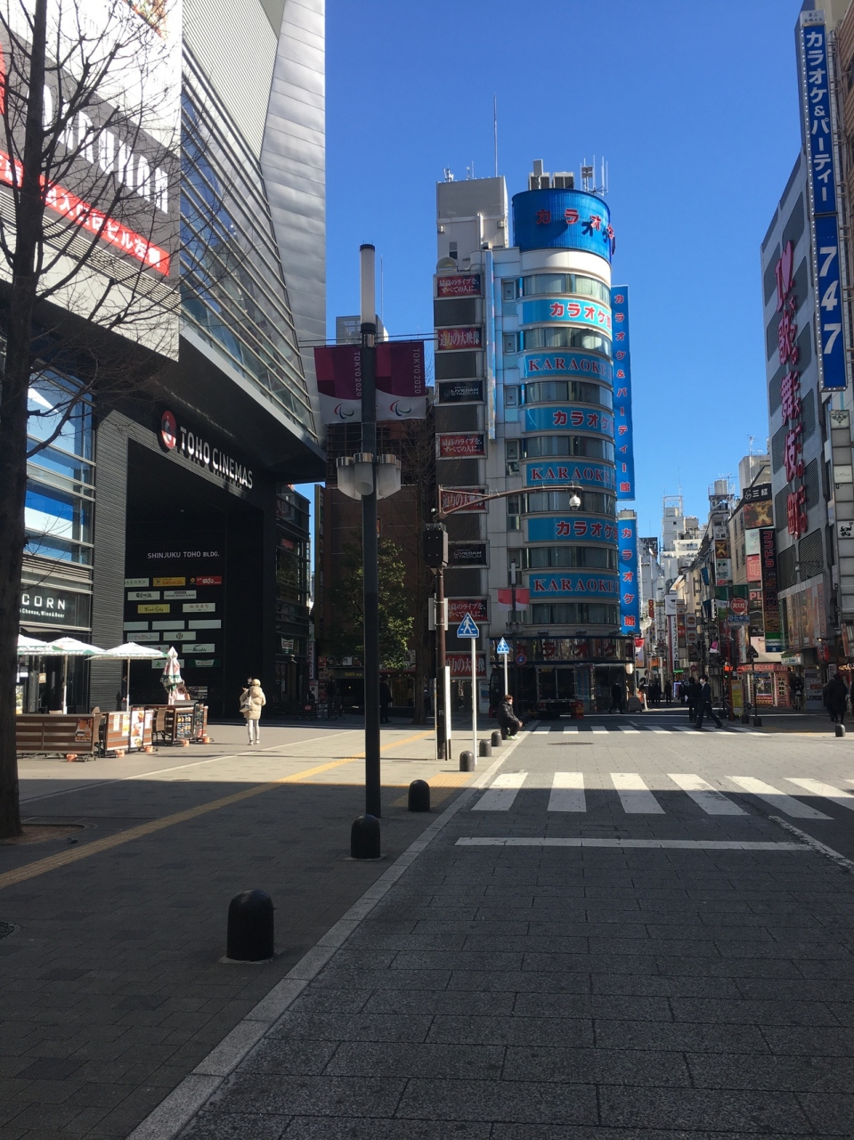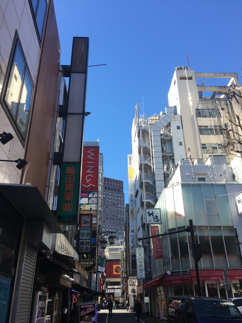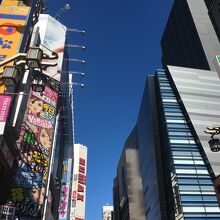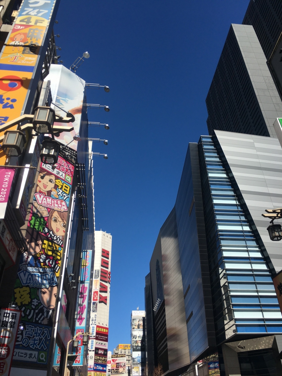 何本も枝道があり、どの通りも狭いながら店がびっしりと連なり昼でも看板のネオンが派手に光っていました。しばらく歩くと広い通りに出て、空間もありました。中央に高層ビルがありましたが、他には高いビルはなく中規模ビル群が多かったです。