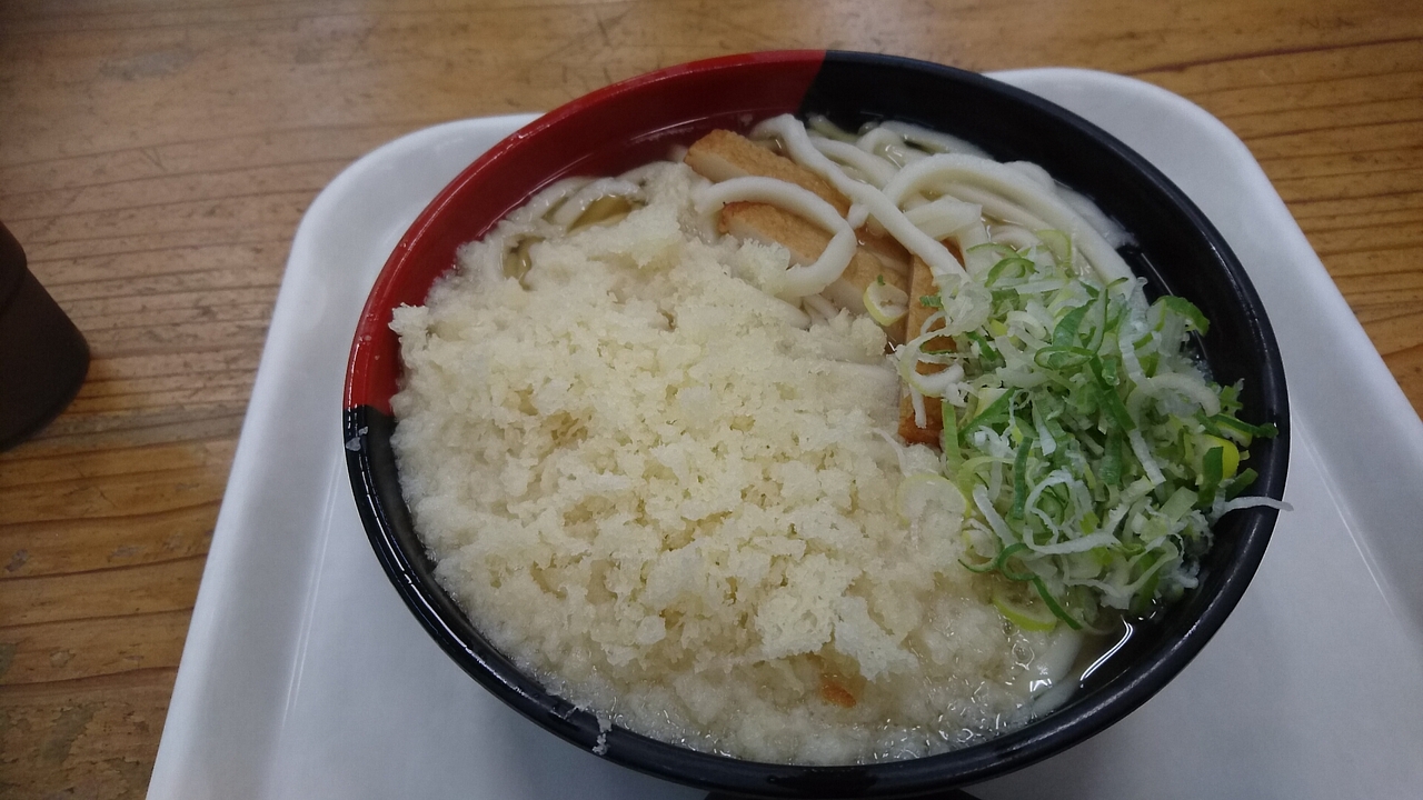 博多のうどんみたいに柔らかめで、胃に優しく、トッピングの天かすも良いアクセントです。